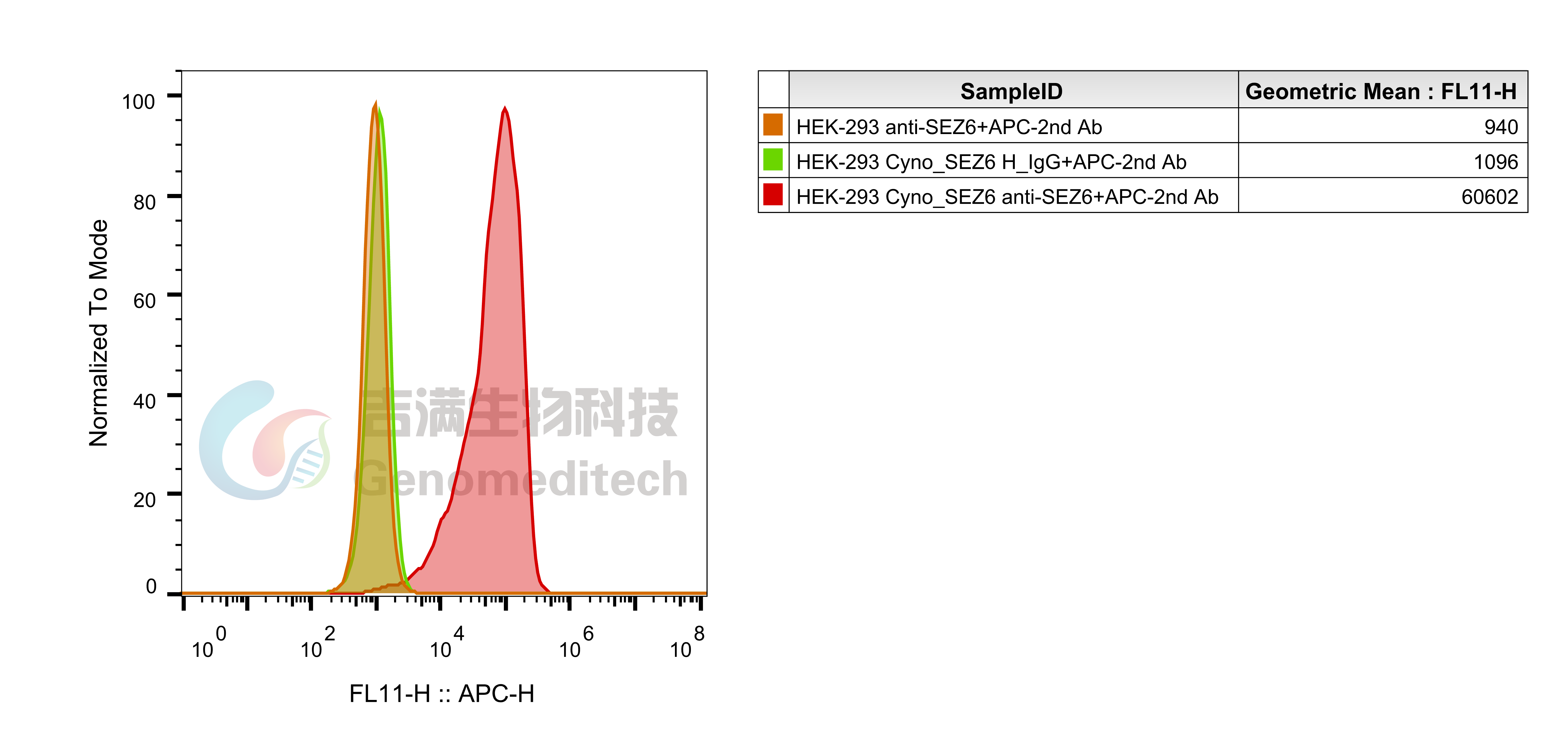 Cynomolgus_SEZ6 HEK-293 Cell Line (Cat. GM-C37977) was determined by flow cytometry using Anti-SEZ6 hIgG1 Reference Antibody (ABBV-011) (Cat. GM-86892MAB).