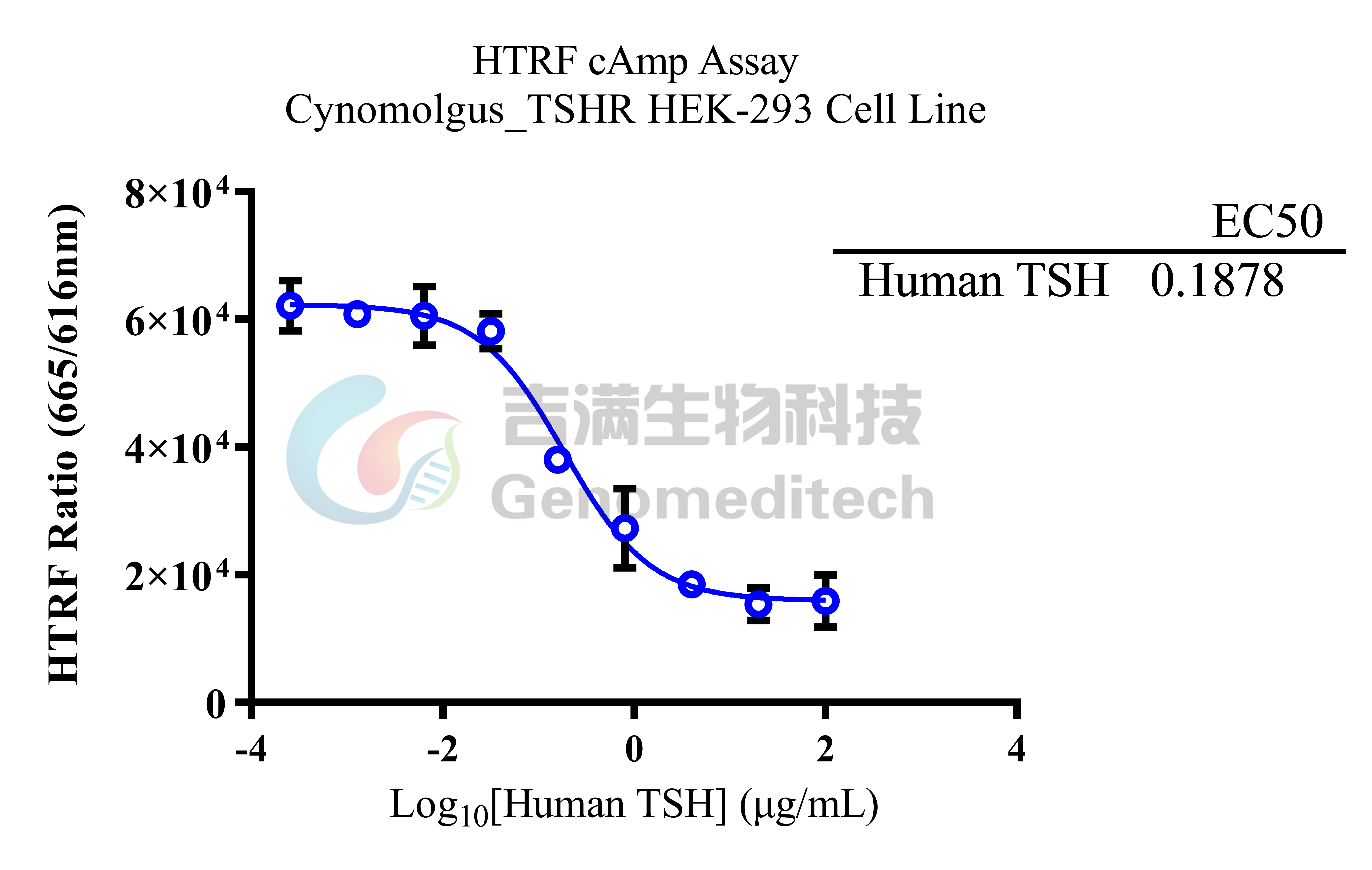 Cynomolgus_TSHR HEK-293 cells were seeded at a density of 7500 cells per well in white 384‑well microplates (5 µL per well). Gradient‑diluted Human TSH solutions were then added, and the cells were incubated at room temperature for 30 minutes. The HTRF Camp Gs Dynamic Detection Kit (Revvity, Cat. No. 62AM4PEB) was used according to the manufacturer’s instructions. Fluorescence signals were measured using a Molecular Devices i3x multi‑mode plate reader with excitation at 340 nm and emissions detected at 616 nm and 665 nm. The data were expressed as the 665 nm/616 nm × 100,000 (HTRF Ratio) and used to calculate the EC50 value.