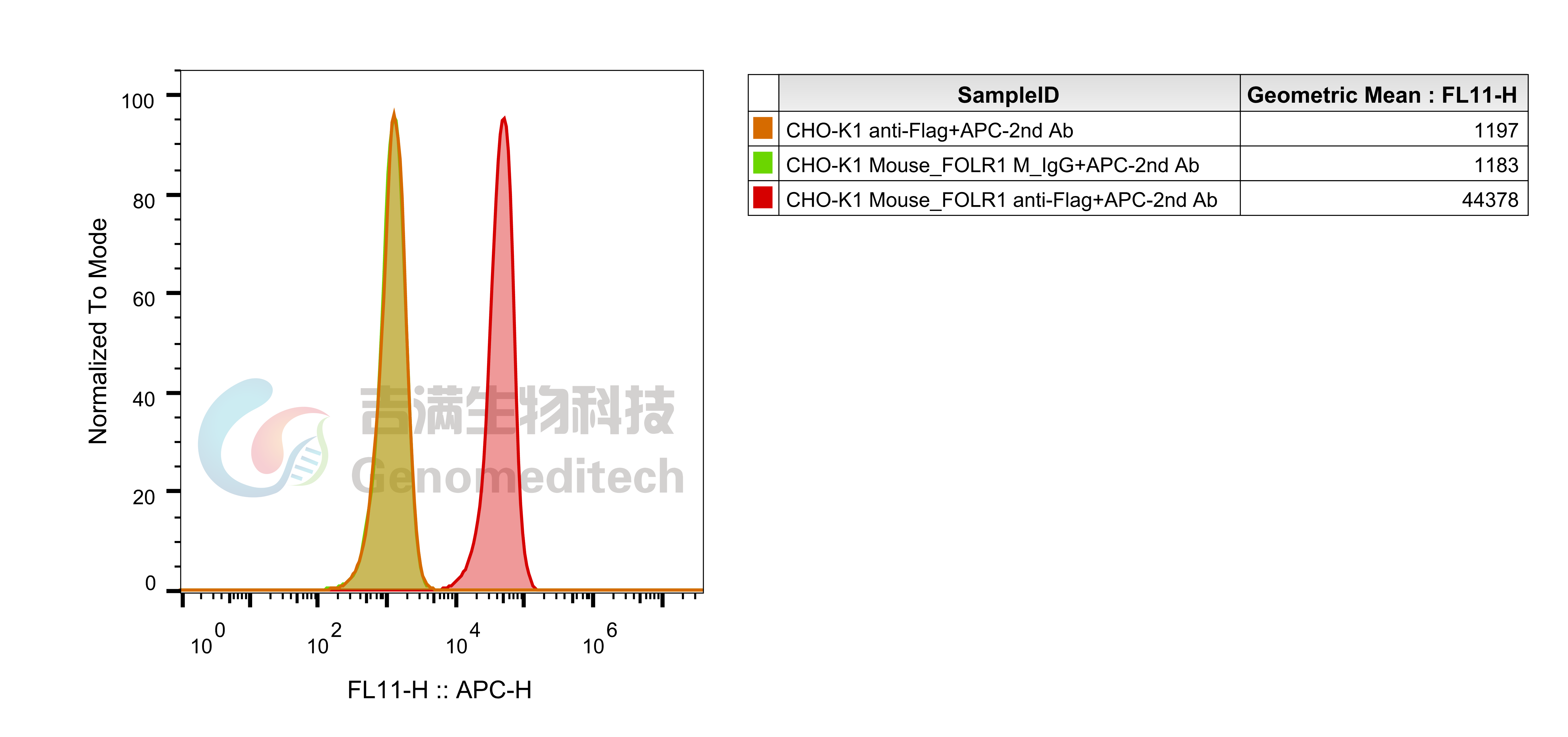 Flag-Mouse_FOLR1 CHO-K1 Cell Line (Cat. GM-C42541) was determined by flow cytometry using Anti-Flag mIgG1 Antibody (Cat. GM-30726AB).