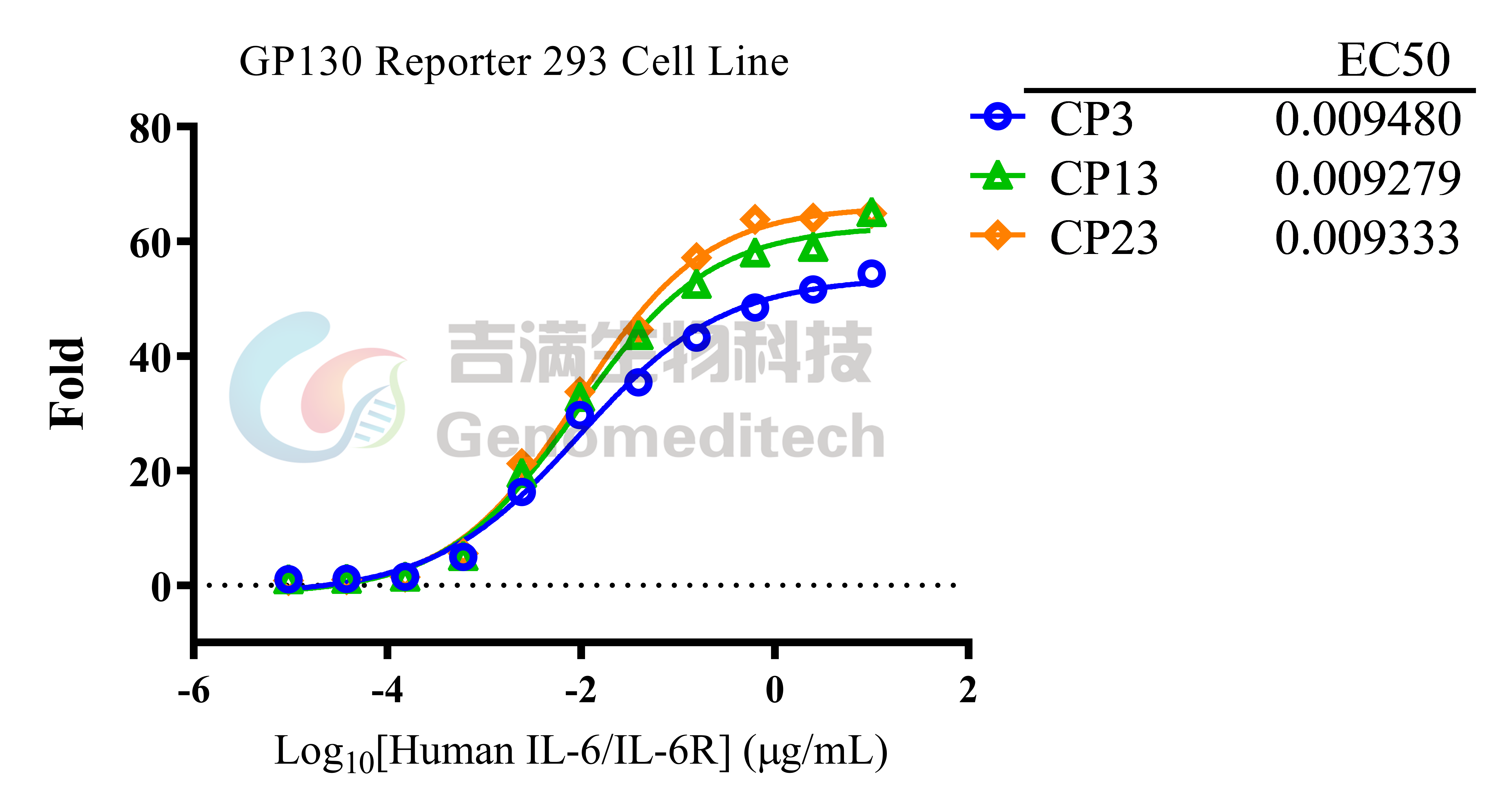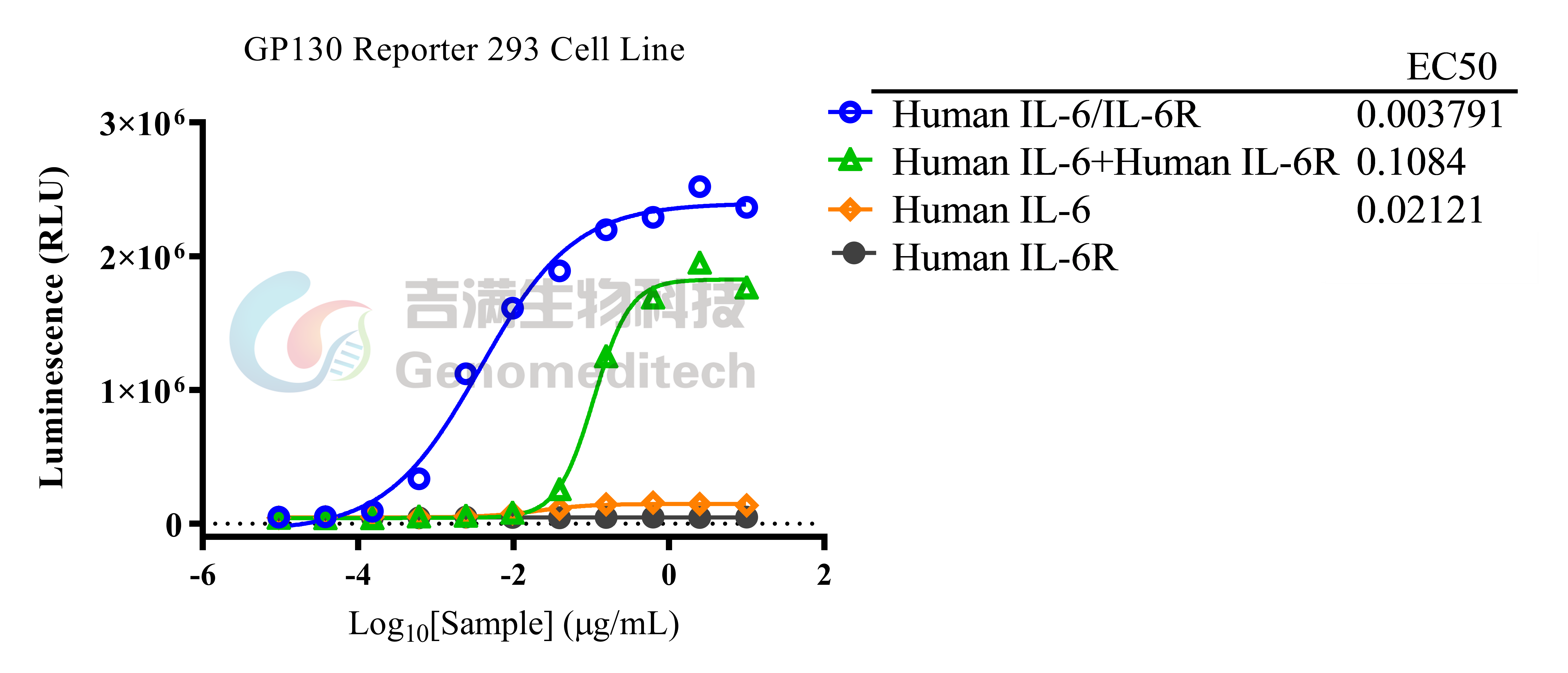 Response to Recombinant Protein. The GP130 Reporter 293 Cell Line (Cat. GM-C39792) at a concentration of 1.5E4 cells/well (96-well format) was stimulated with serial dilutions of Human IL-6/IL-6R (R&D/8954-SR), Human IL-6 (PeproTech/200-06), Human IL-6R (PeproTech/200-06RC) and a mixed solution of Human IL-6R and Human IL-6 in assay buffer (DMEM + 1% FBS + 1% P.S.) for 6 hours. The firefly luciferase activity was measured using the Luciferase Reporter Assay Kit (Genomeditech). The maximum induction fold of Human IL-6/IL-6R was approximately [48.7]. Data are shown as drug mass concentration.