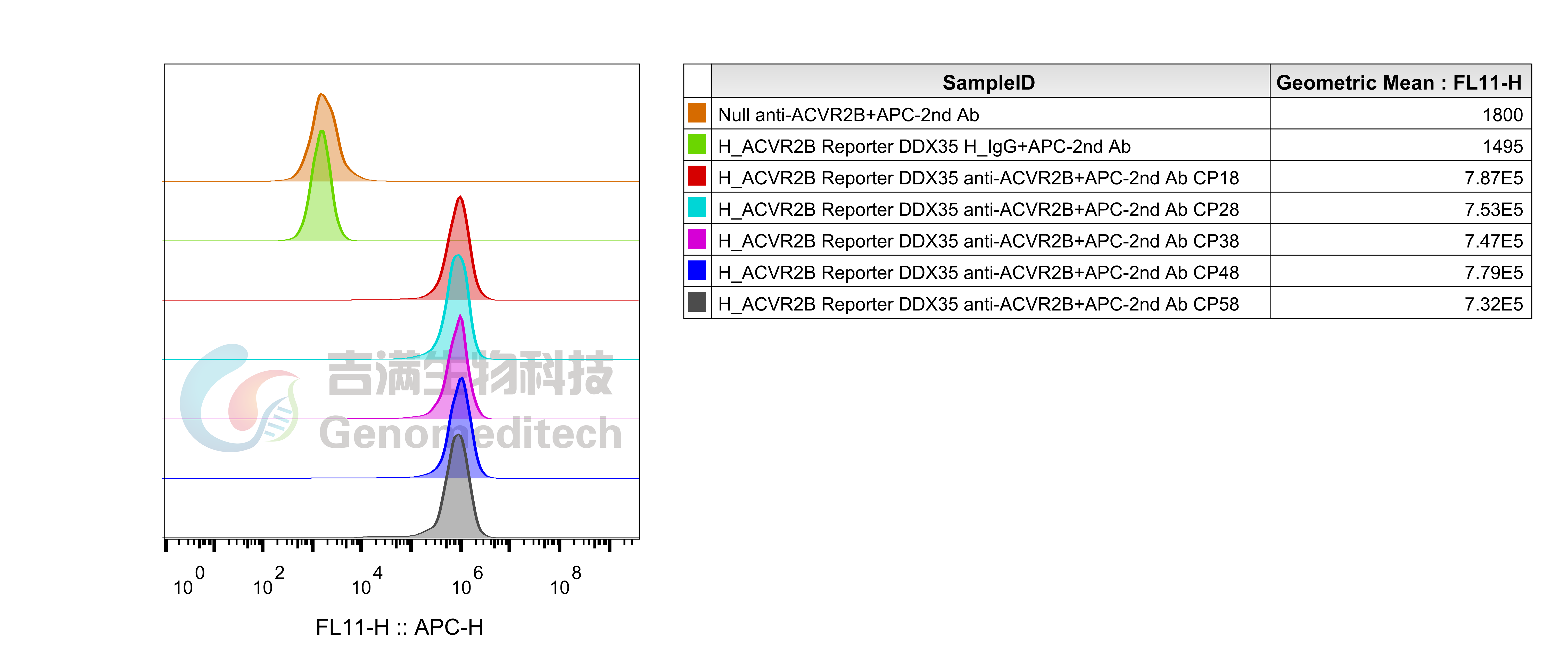 The passage stability of the H_ACVR2B Reporter DDX35™ Cell Line (Cat. GM-C39211) was determined by flow cytometry using Anti-ACVR2B hIgG1 Antibody(Fab-17G05) (Cat. GM-82350AB).