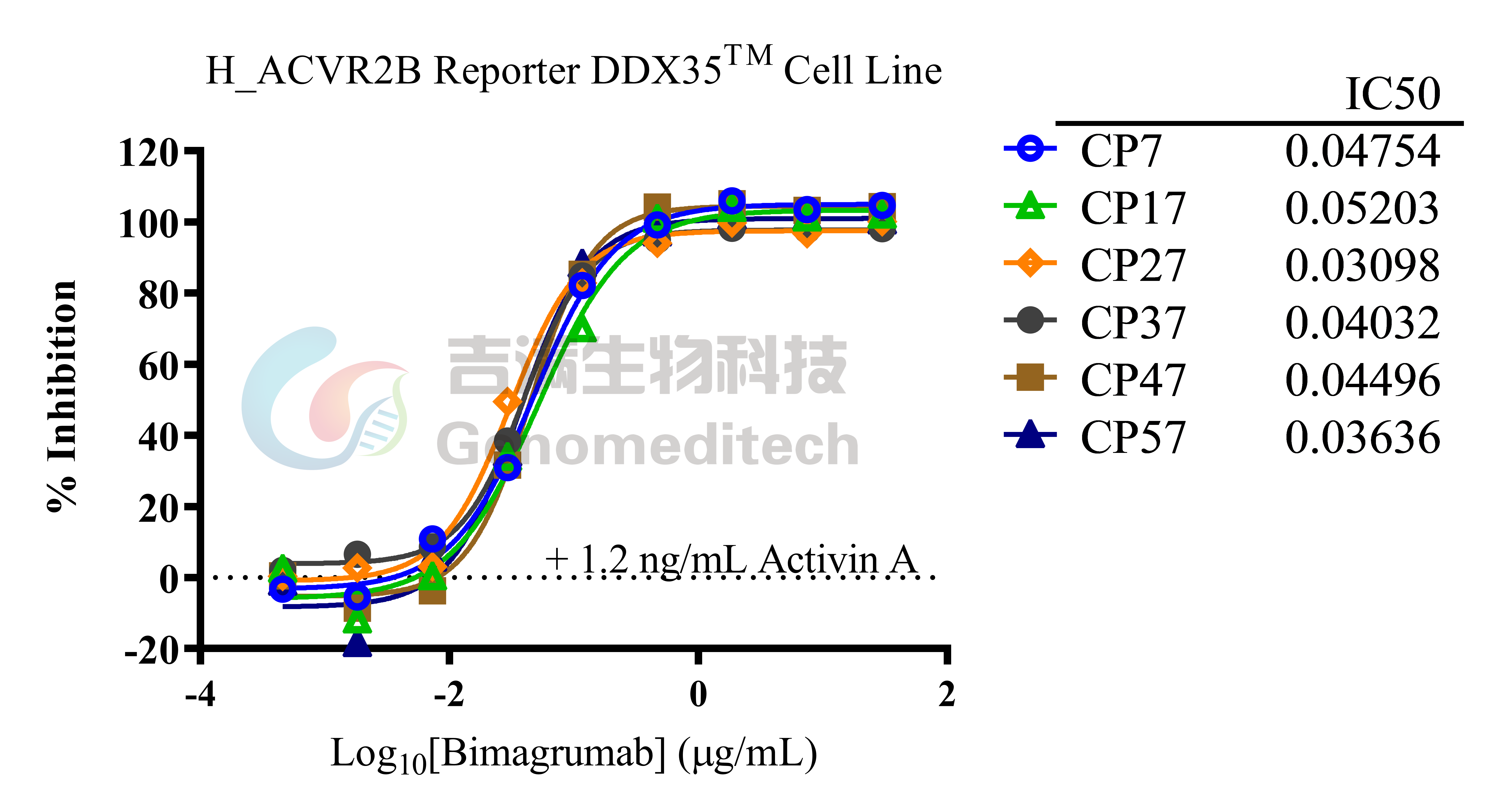 Response to Anti-ACVR2B hIgG1 Antibody (Bimagrumab). Serial dilutions of antibodies were incubated with 1.5E4 cells/well of the H_ACVR2B Reporter DDX35™ Cell Line (Cat. GM-C39211) in a 96-well plate for 1 hour. Then, 1.2 ng/mL of Human Activin A Protein (Cat. GM-87616RP) was added, and the incubation continued in assay buffer (DMEM+1% FBS+1% P.S) for 6 hours. Firefly luciferase activity is measured using the Luciferase Reporter Assay Kit (Genomeditech). The results indicated a maximum blocking fold of approximately [5.2]. Data are shown by drug mass concentration.