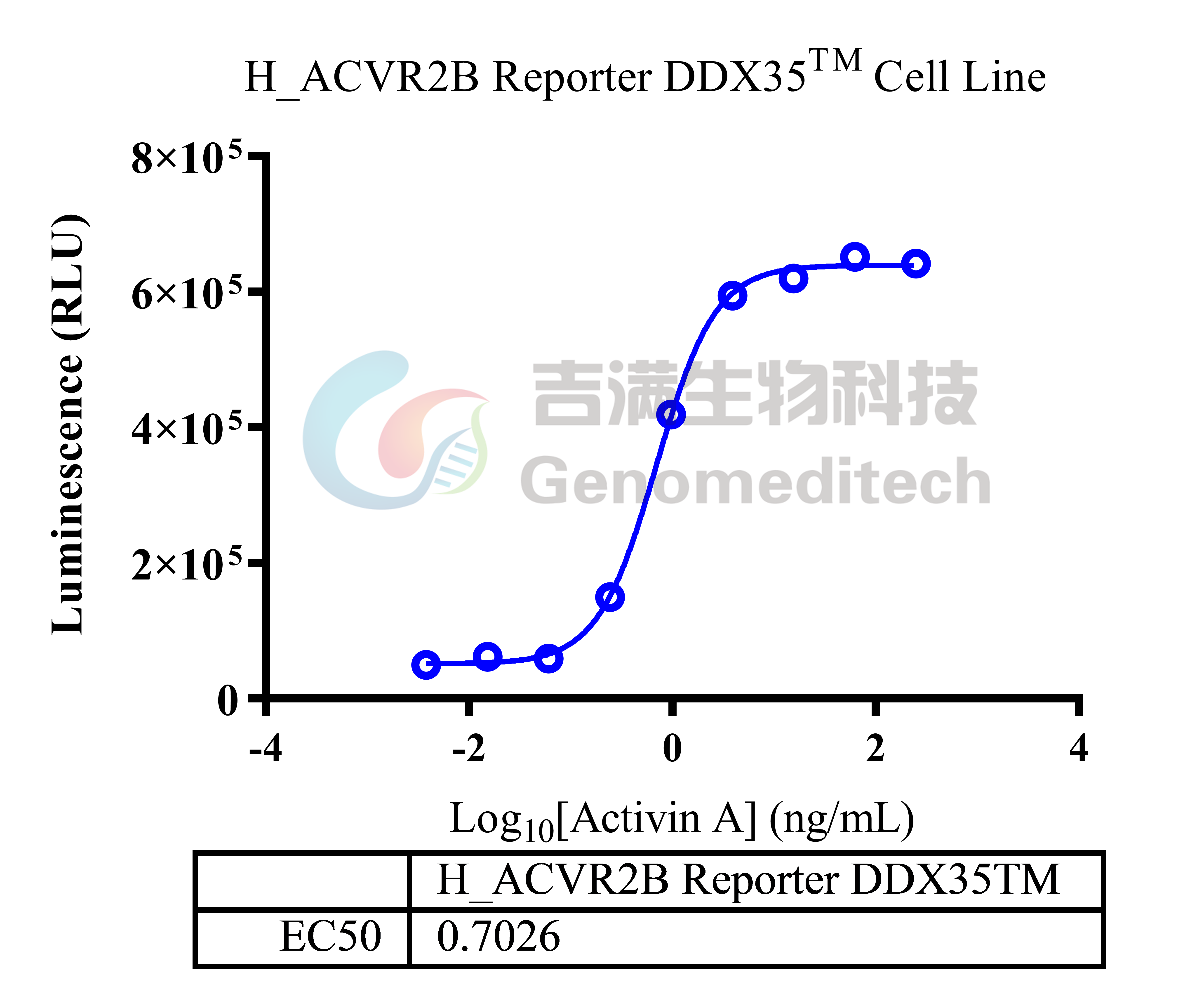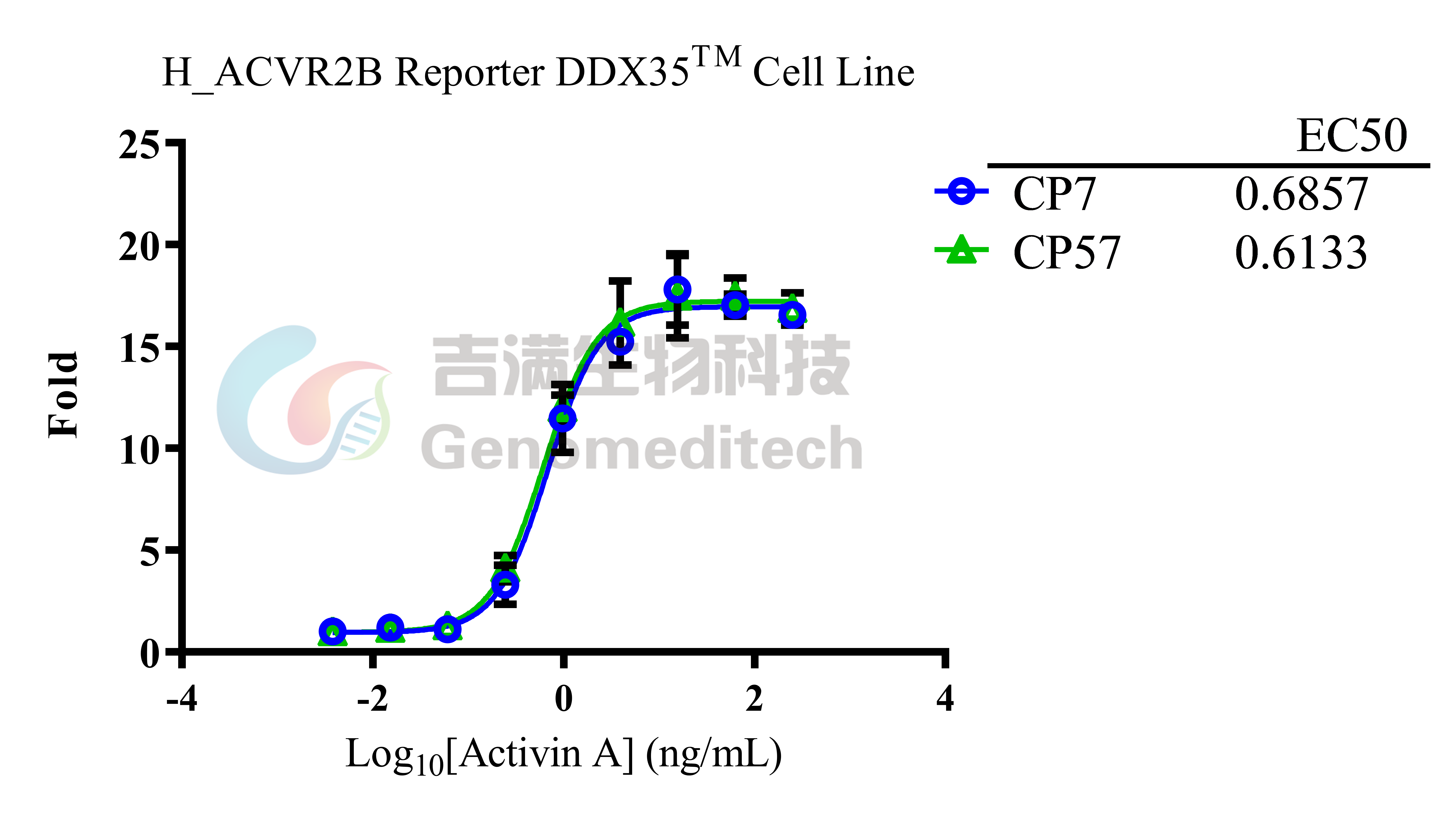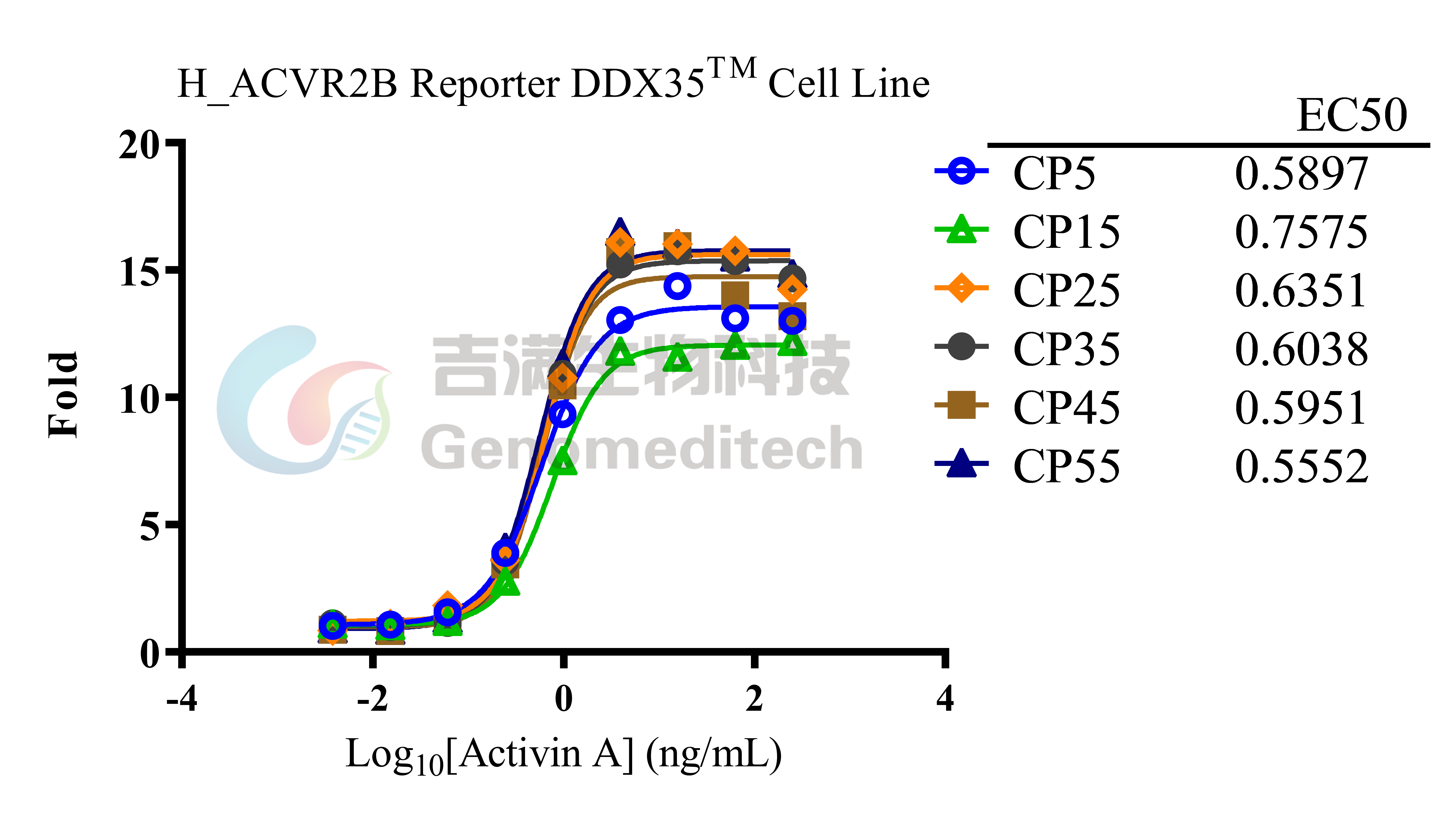Response to Human Activin A Protein. H_ACVR2B Reporter DDX35™ Cell Line (Cat. GM-C39211) at a concentration of 1.5E4 cells/well (96-well format) was stimulated with serial dilutions of Human Activin A Protein (Cat. GM-87616RP) in assay buffer (DMEM+1% FBS+1% P.S) for 6 hours. The firefly luciferase activity was measured using the Luciferase Reporter Assay Kit (Genomeditech). The maximum induction fold was approximately [16.3]. Data are shown by drug mass concentration.