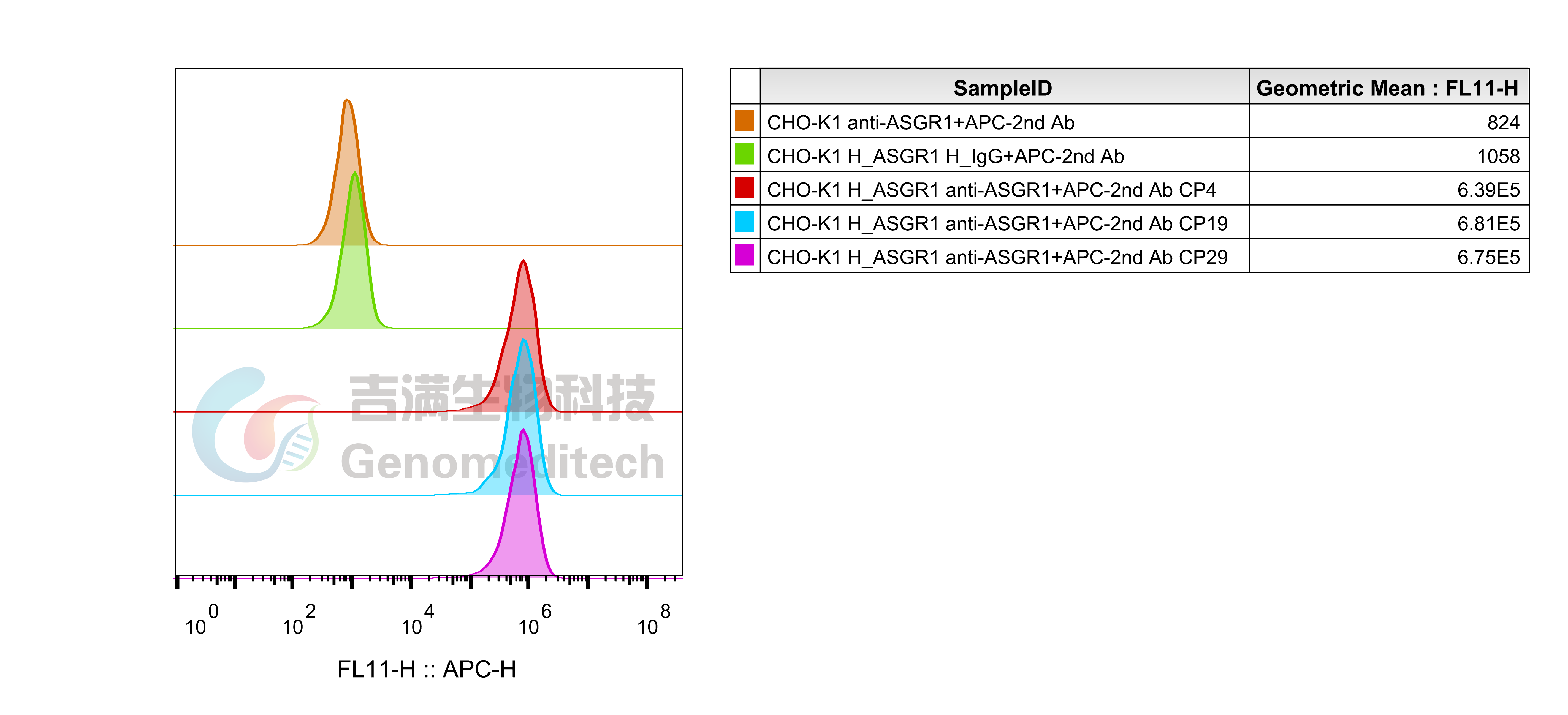 H_ASGR1 CHO-K1 Cell Line (Cat. GM-C41612) was determined by flow cytometry using Anti-ASGR1 hIgG1 antibody(4A2.001)(Cat. GM-88205AB).