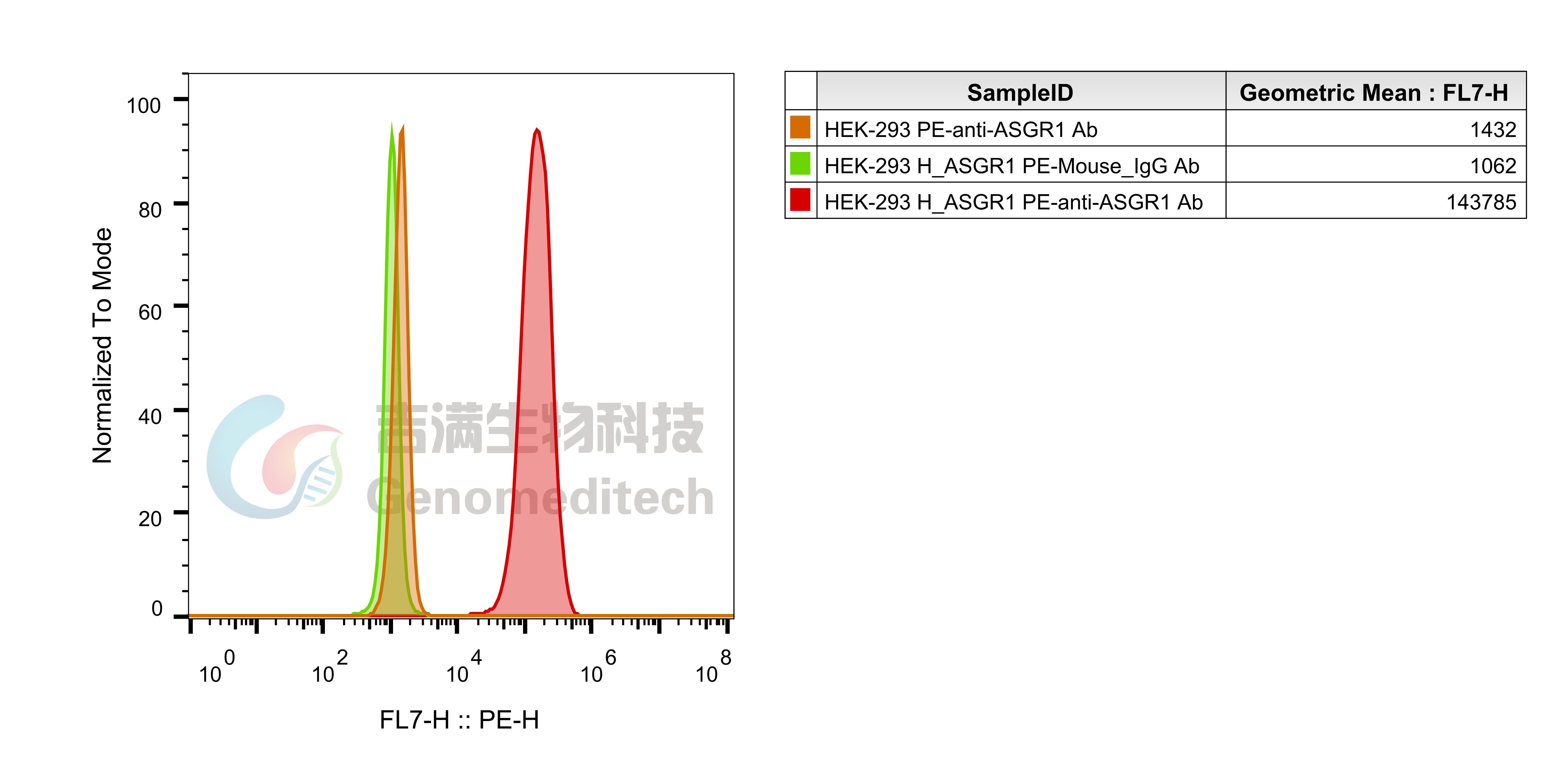 H_ASGR1 HEK-293 Cell Line (Cat. GM-C41613) was determined by flow cytometry Anti-ASGR1 Antibody (PE), Mouse Monoclonal (SinoBiological/10773-MM02-P).