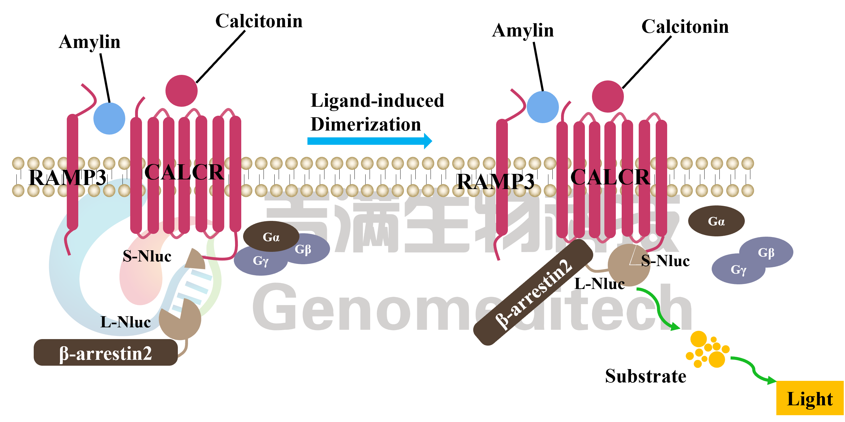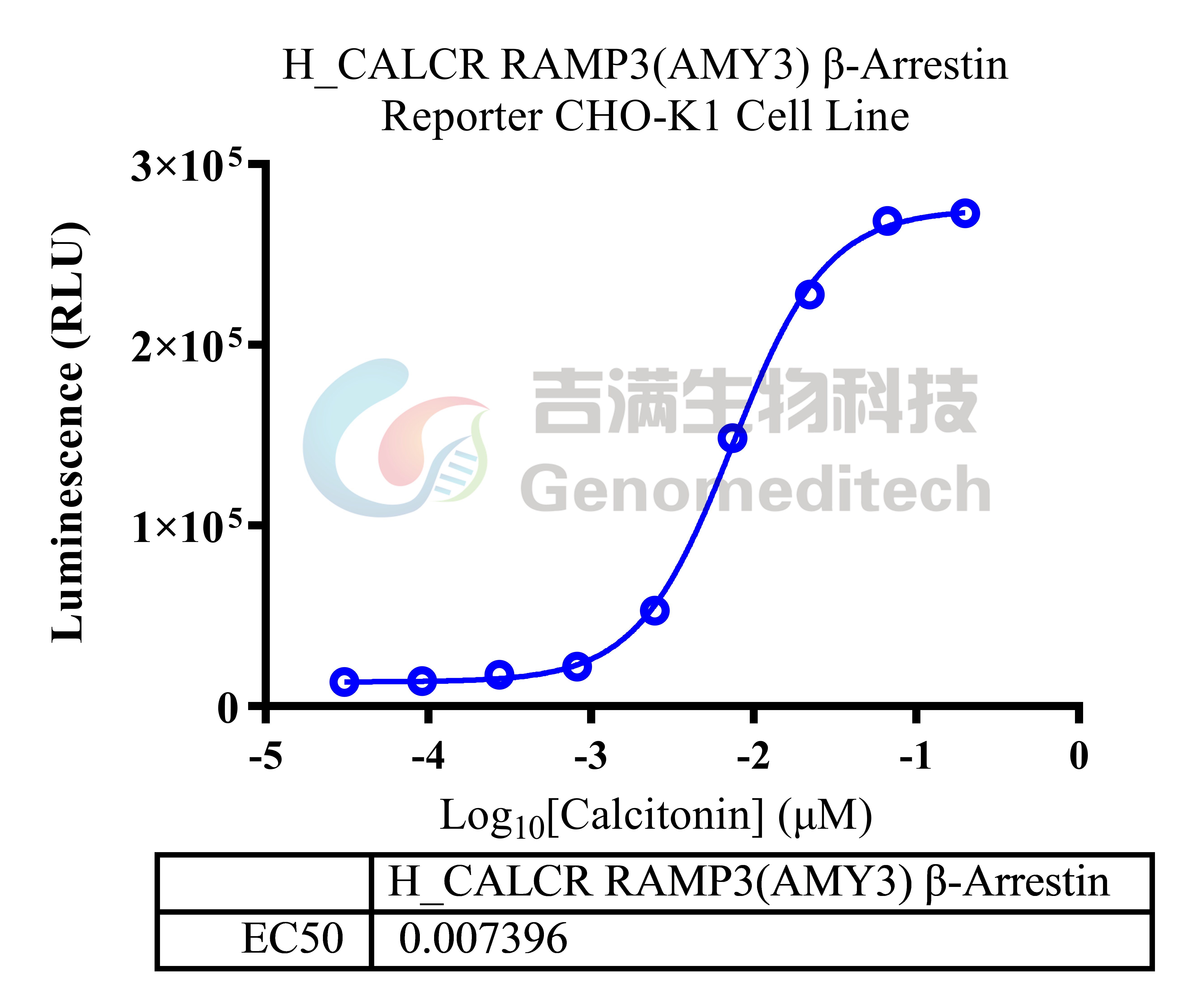 The H_CALCR RAMP3(AMY3) β-Arrestin Reporter CHO-K1 Cell Line is a clonal stable CHO-K1 cell line constructed using lentiviral technology, constitutive expression of the CALCR and RAMP3 genes, and detected using enzyme fragment complementation (EFC) technology. When the ligand binds to CALCR/RAMPs, it recruits β-arrestin fused with a downstream luciferase reporter gene. Upon addition of the luciferase substrate, the enzyme catalyzes the substrate reaction, producing a detectable luminescent signal. Therefore, this system can be used to evaluate the in vitro efficacy of related drugs.