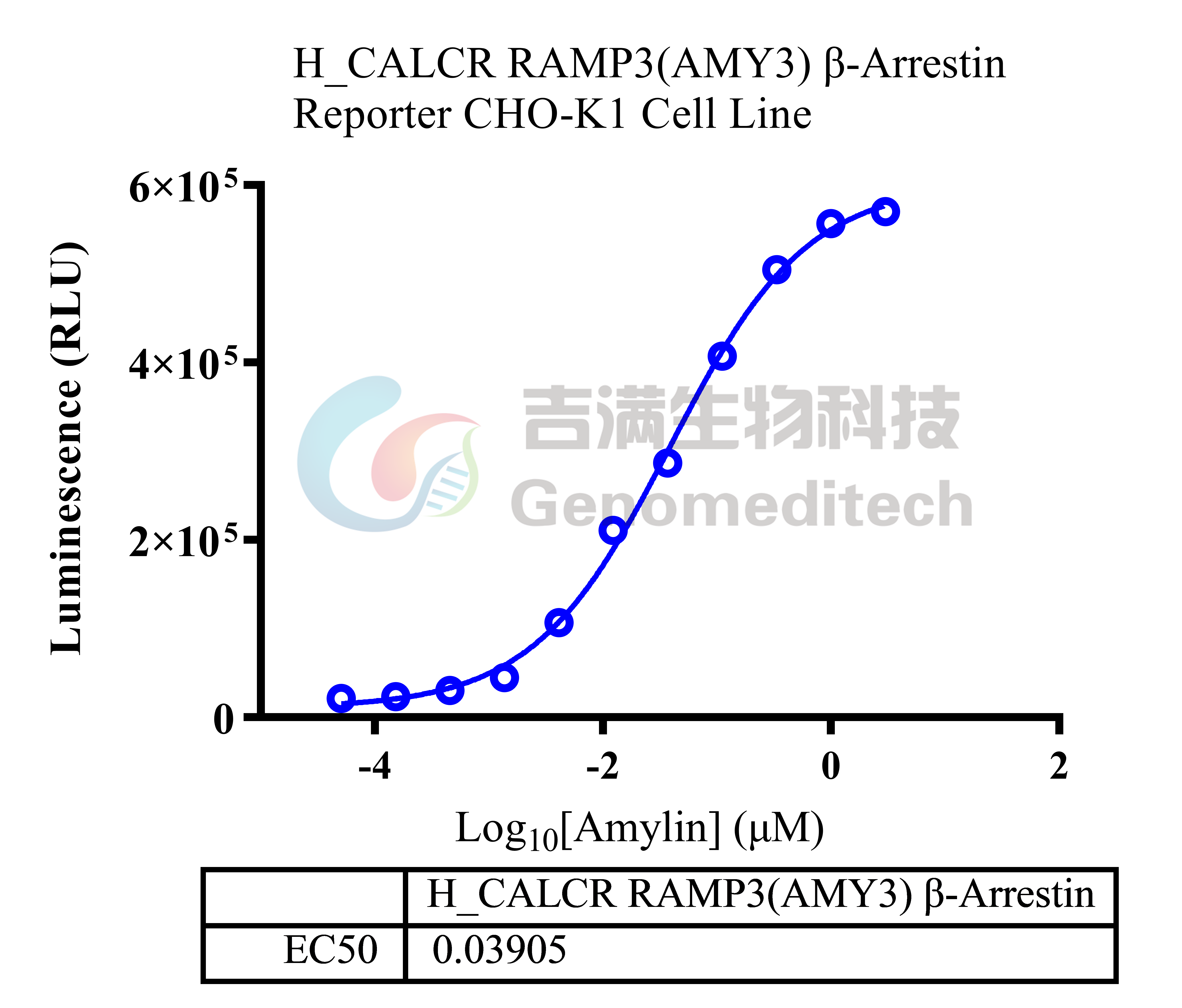 Response to Amylin. The H_CALCR RAMP3(AMY3) β-Arrestin Reporter CHO-K1 Cell Line (Cat. GM-C42213) at a concentration of 1E4 cells/well (96-well format) was stimulated with serial dilutions of Amylin (GenScript/RP11278CN) in assay buffer (F12K+1% FBS+1% P.S) for 6 hours. The firefly luciferase activity was measured using a detection kit. The maximum induction fold was approximately [32.9]. Data are shown by drug molar concentration.