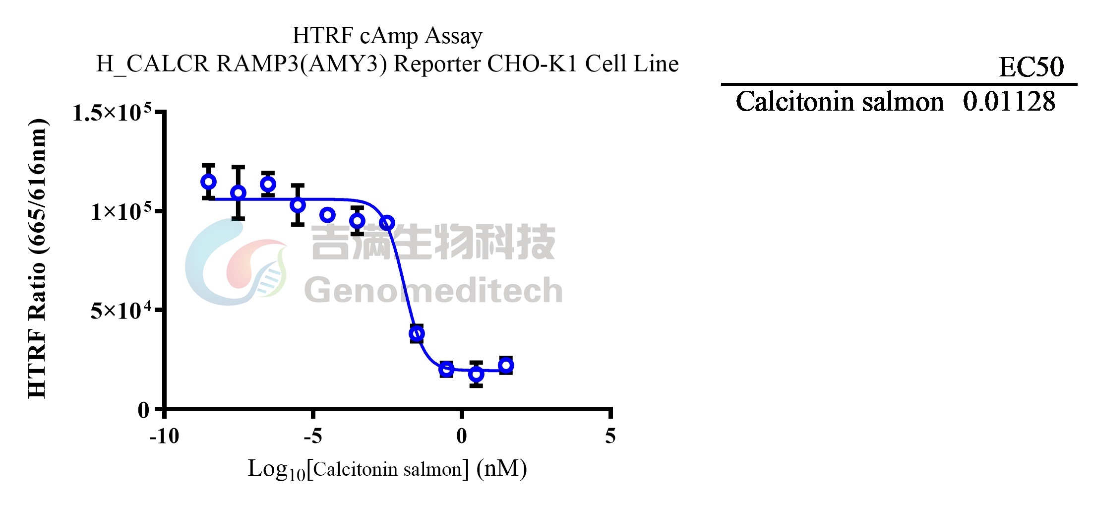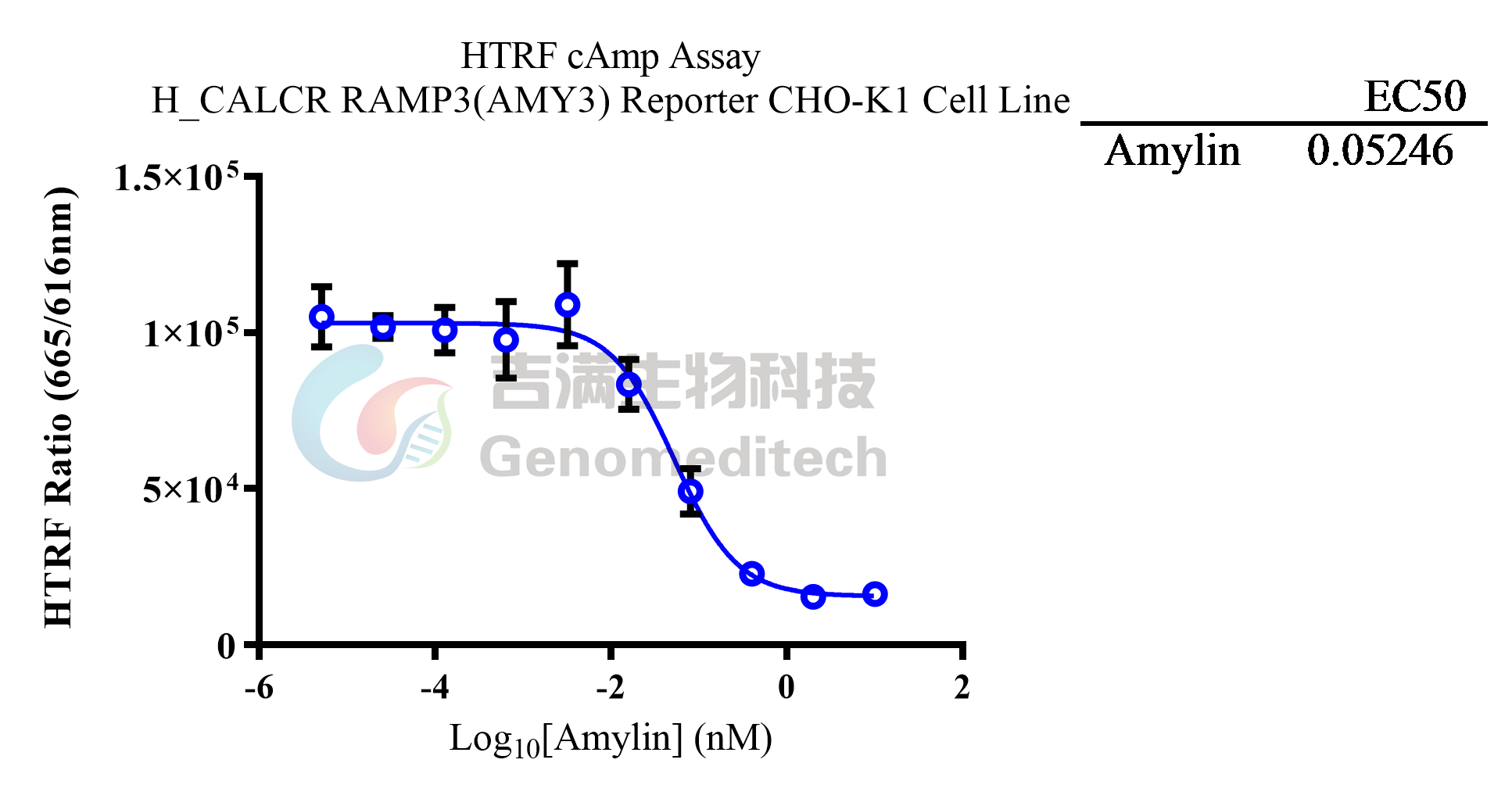 | Cat. No: GM-C26533 Product: H_CALCR RAMP3(AMY3) Reporter CHO-K1 Cell Line The Calcitonin Gene Related Peptide (CGRP) family includes several important peptides: Calcitonin (CT), Amylin, and Adrenomedullin (AM). Amylin is produced by the pancreas and is a hormone that regulates nutrient intake. The binding of Amylin to its receptors involves three classes of potential receptors, which are complexes of the Calcitonin Receptor (CALCR) and Receptor Activity Modifying Proteins (RAMPs). RAMPs are a series of type I single-transmembrane proteins that function by forming heterodimers with G protein-coupled receptors. There are three RAMP subtypes: RAMP1, RAMP2, and RAMP3. Although these RAMPs are structurally similar, their amino acid sequences are only about30% identical. After binding to the receptor, Amylin can form different complexes: CALCR combined with RAMP1 forms the Amy1 complex, CALCR combined with RAMP2 forms the Amy2 complex, and CALCR combined with RAMP3 forms the Amy3 complex. The H_CALCR RAMP3 (AMY3) Reporter CHO-K1 Cell Line is a clonal, stable cell line that constitutively expresses human CALCR and human RAMP3, along with a signal-dependent expression of a luciferase reporter gene. The binding of Amylin to the receptor complex activates downstream reporter genes, leading to luciferase expression. The luciferase readout indicates the activation level of the signaling pathway and can thus be used to evaluate the in vitro effects of drugs related to the CALCR RAMP3 (AMY3) complex. | ![]() |