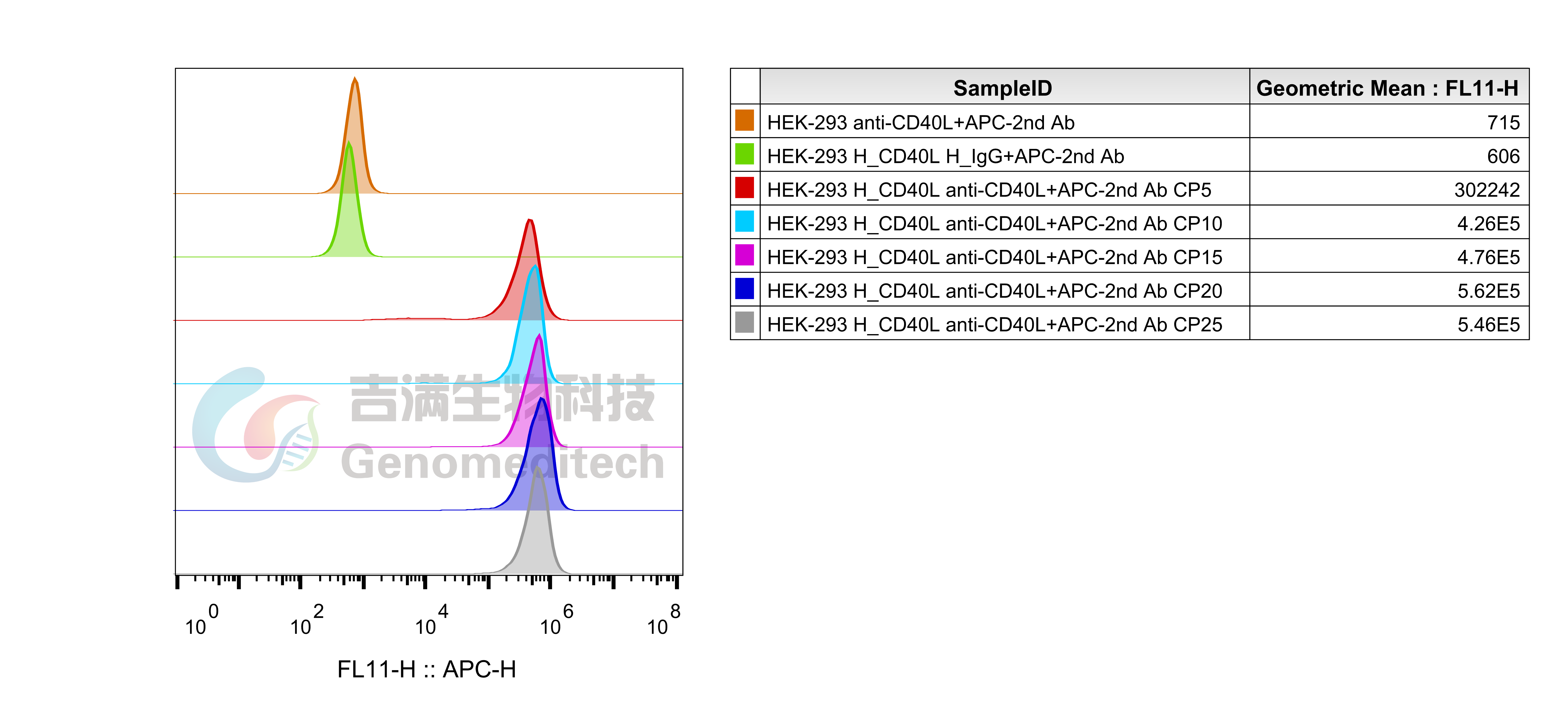 H_CD40L HEK-293 Cell Line (Cat. GM-C35531) was determined by flow cytometry using Anti-H_CD40L hIgG1 Antibody(dapirolizum) (Cat. GM-83977AB).