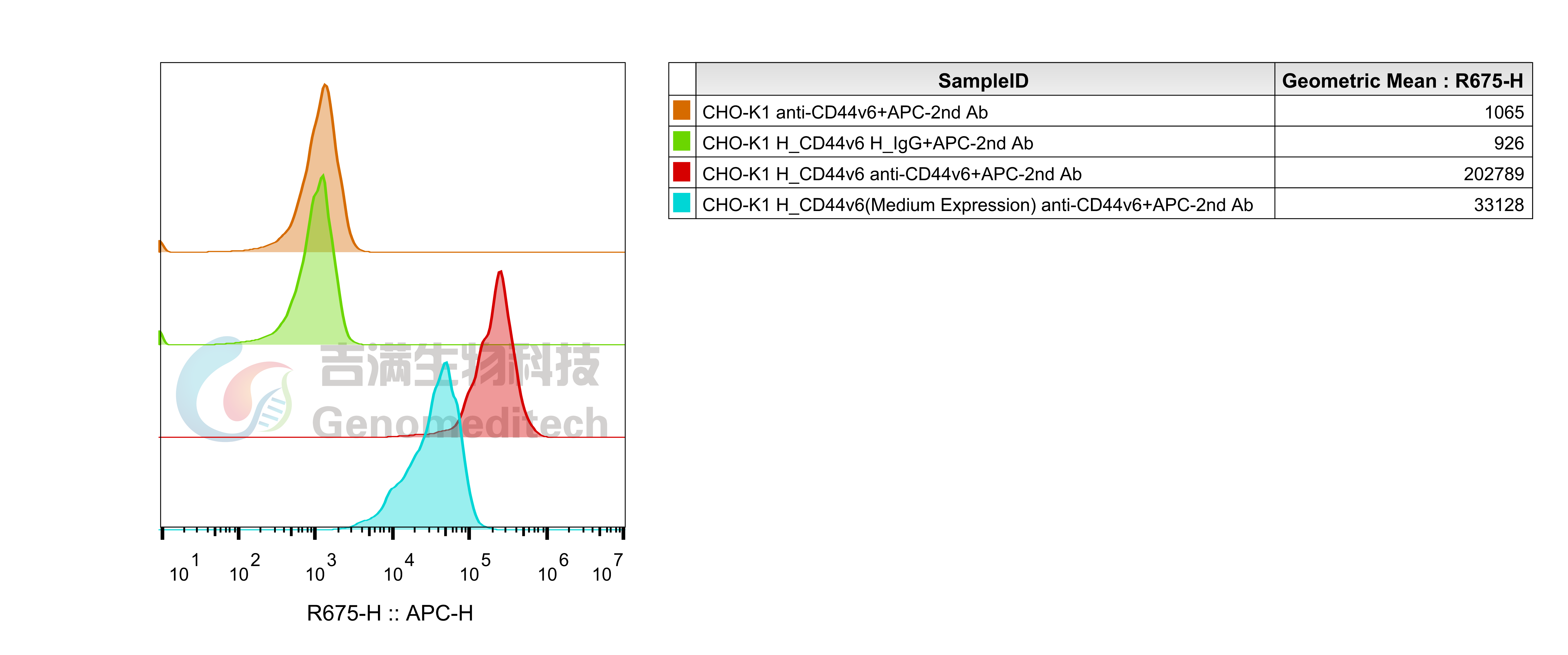 H_CD44v6 CHO-K1 Cell Line (Medium Expression) (Cat. GM-C45406) was determined by flow cytometry using Anti-CD44v6 hIgG1 Antibody(bivatuzumab) (Cat. GM-87692AB).