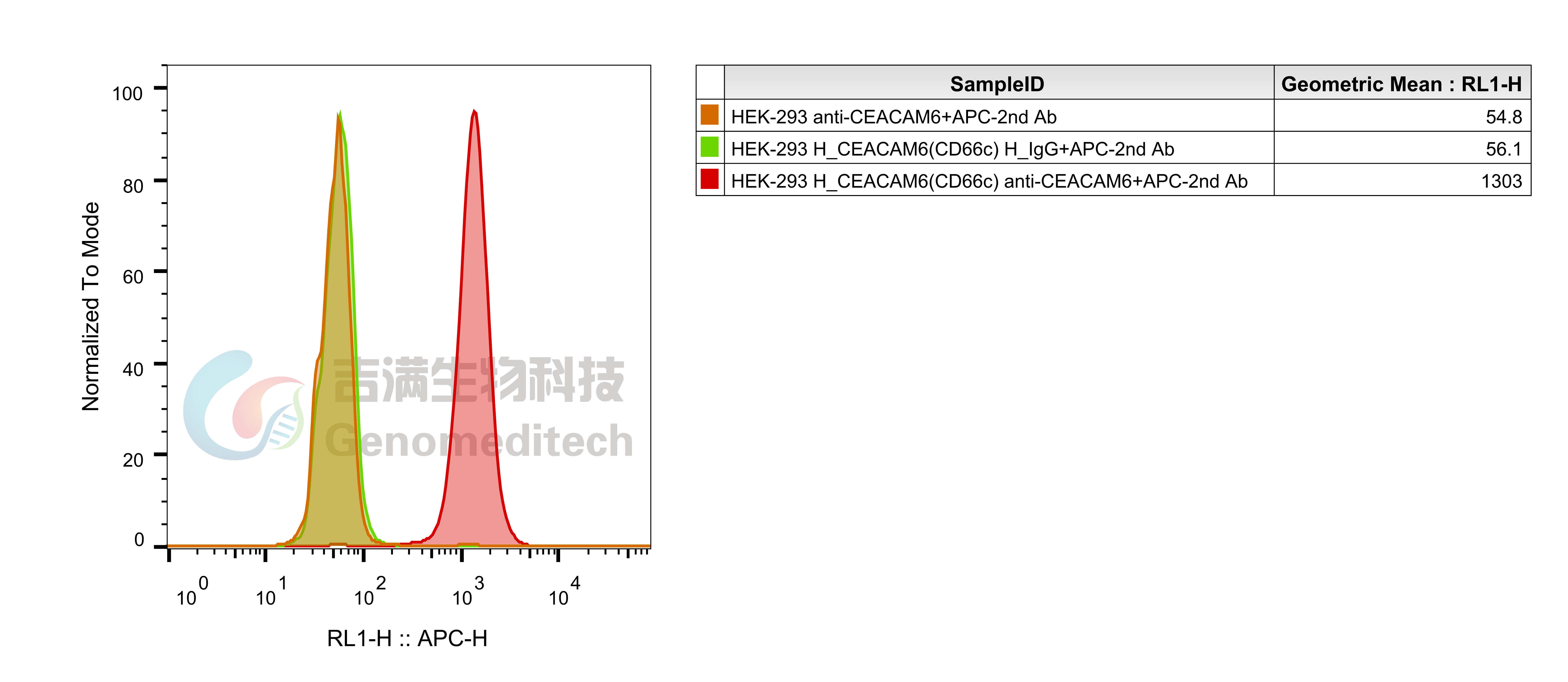 H_CEACAM6(CD66c) HEK-293 Cell Line (Cat. GM-C24404) was determined by flow cytometry using Anti-H_CEACAM6(CD66c) hIgG1 Antibody (Cat. GM-30166AB).