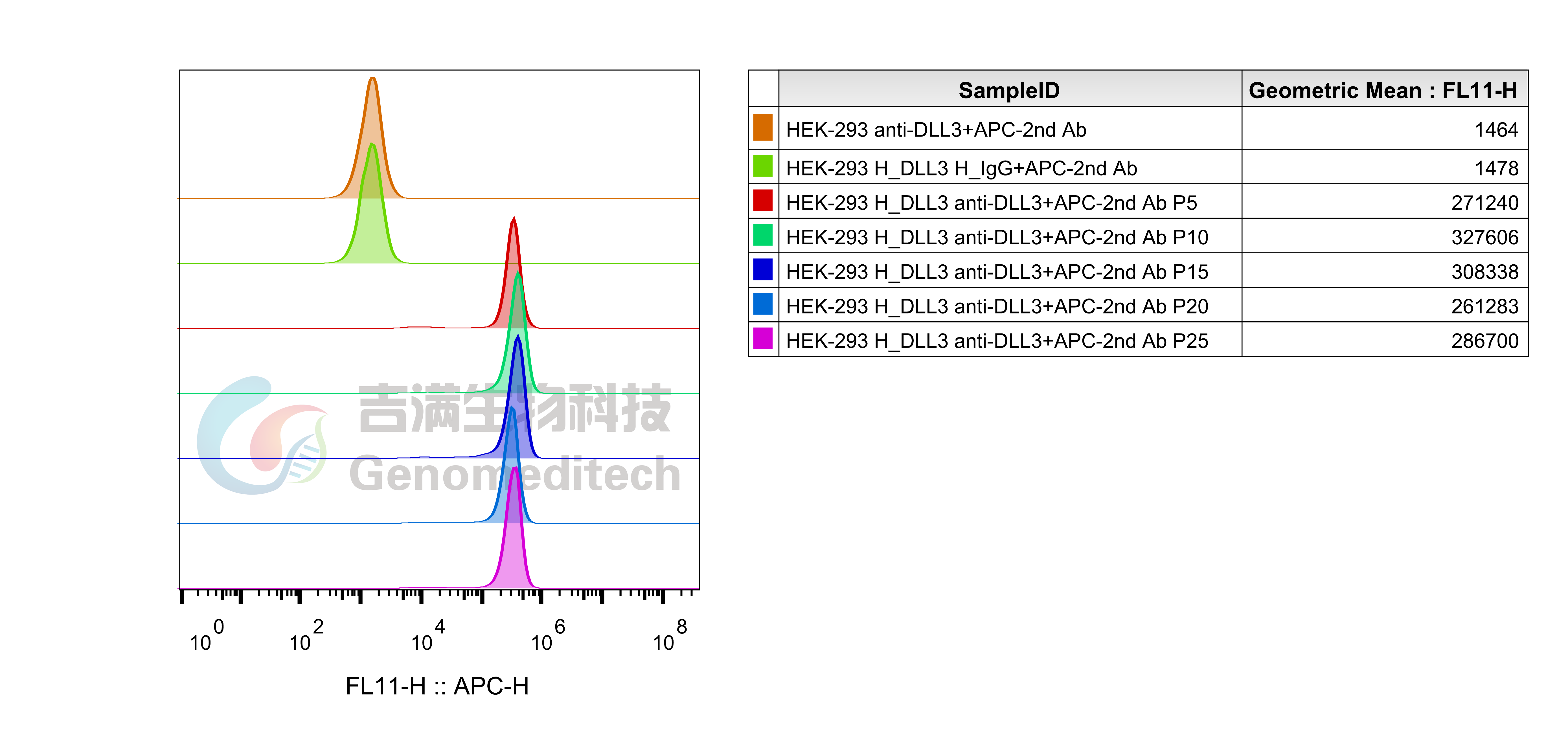 The passage stability of the H_DLL3 HEK-293 Cell Line (Cat. GM-C12896) was determined by flow cytometry using Anti-H_DLL3 hIgG1 Antibody(Rovalpituzumab) (Cat. GM-26560AB).