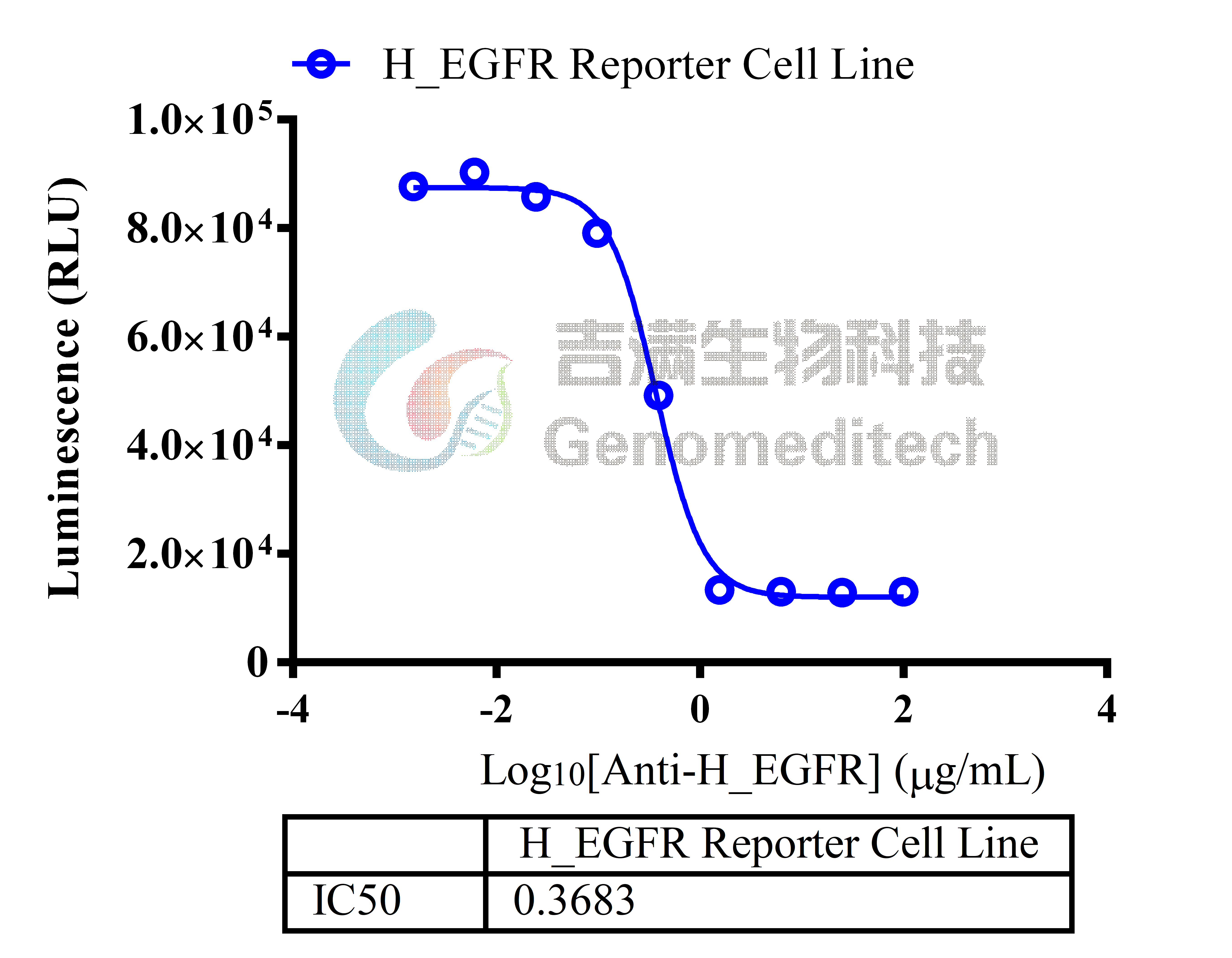 Response to Anti-H_EGFR hIgG1 Antibody(Necitumumab). Serial dilutions of the Anti-H_EGFR hIgG1 Antibody(Necitumumab) (Cat. GM-49155AB) was incubated with 1.5E4 cells/well of the H_EGFR Reporter Cell Line (Cat. GM-C29969) in a 96-well plate for 1 hour in assay buffer (DMEM + 1% FBS + 1% P.S). Subsequently, the Recombinant Human EGF (Beyotime/P5552) at a concentration of 2 ng/well was added, and the coculture proceeded for an additional 7 hours. Firefly luciferase activity is then measured using the Luciferase Reporter Assay Kit (Genomeditech). The results indicated maximum blocking folds of approximately [7.1]. Data are shown by drug mass concentration.