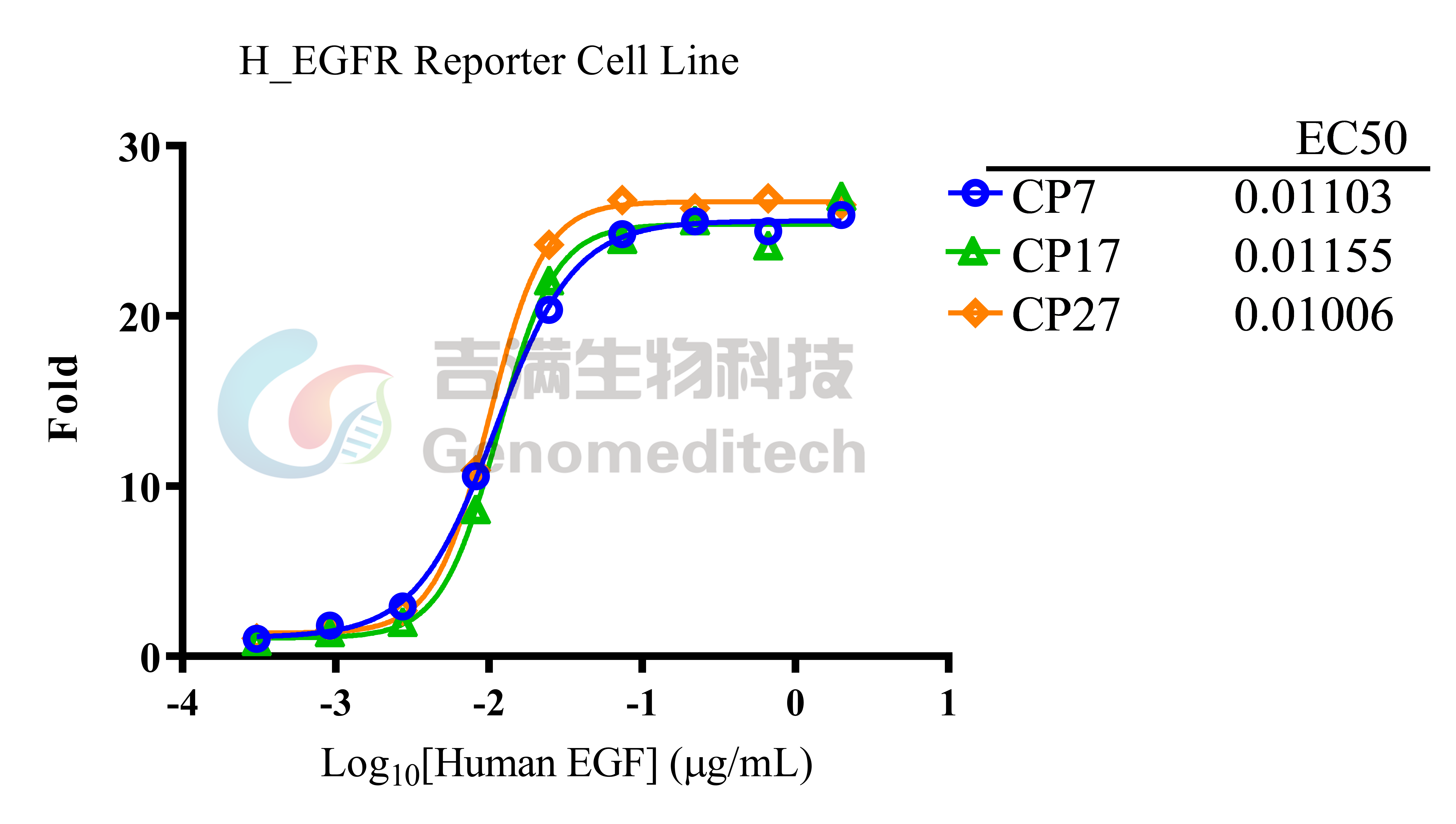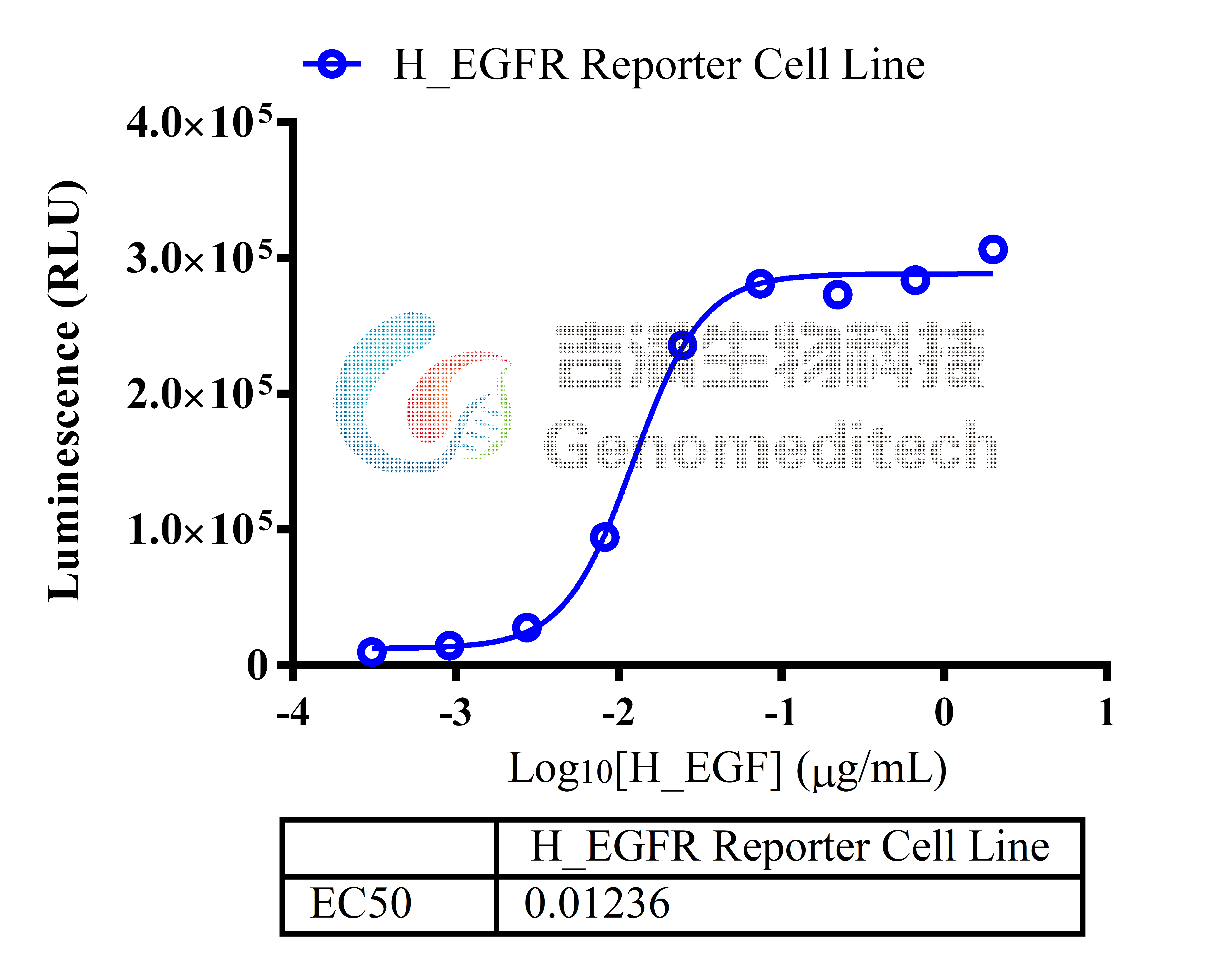 Response to Human EGF protein. H_EGFR Reporter Cell Line (Cat. GM-C29969) at a concentration of 1.5E4 cells/well (96-well format) was stimulated with serial dilutions of Recombinant Human EGF (Beyotime/P5552) in assay buffer (DMEM + 1% FBS + 1% P.S) for 7 hours. The firefly luciferase activity was measured using the Luciferase Reporter Assay Kit (Genomeditech). The maximum induction fold was approximately [37.9]. Data are shown by drug mass concentration.