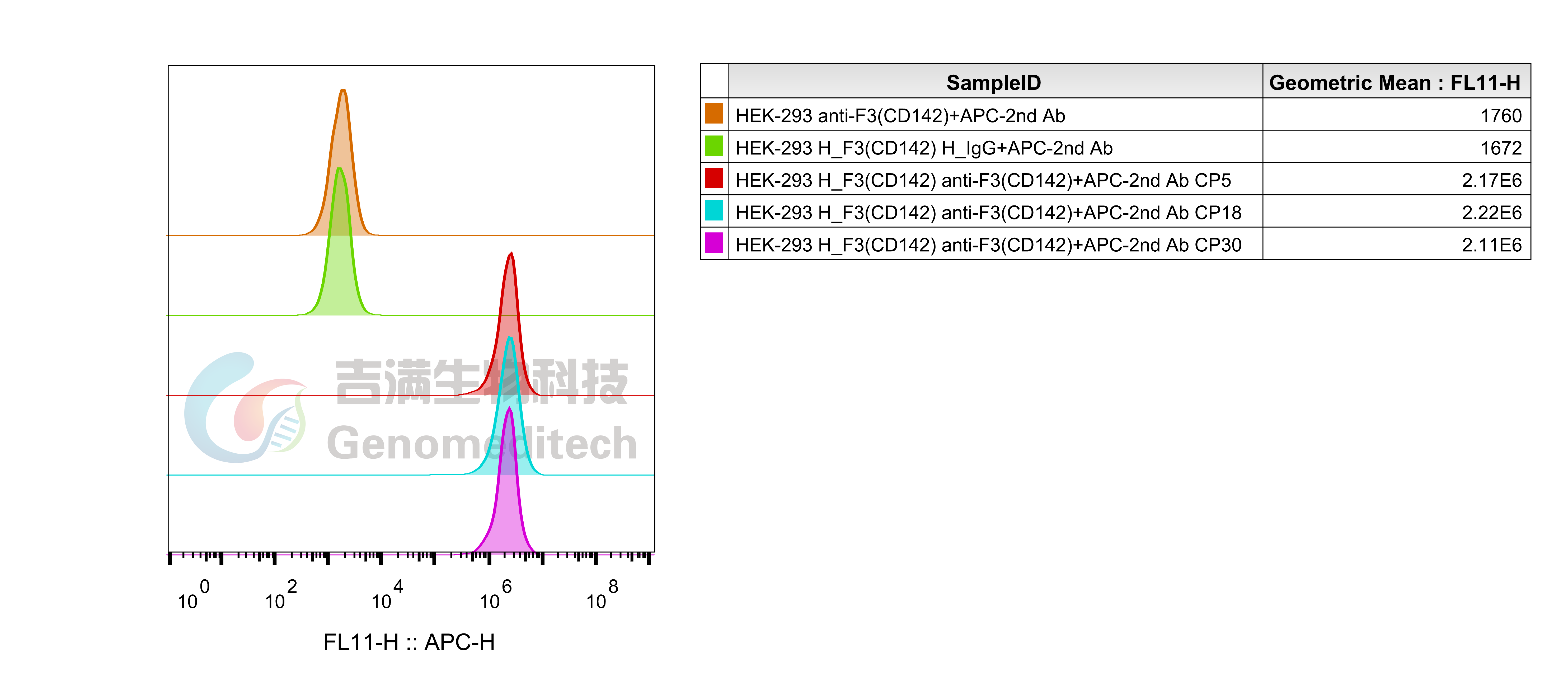 H_F3(CD142) HEK-293 Cell Line (Cat. GM-C39989) was determined by flow cytometry using Anti-F3(CD142) hIgG1 Reference Antibody (Tisbio) (Cat. GM-87834MAB).