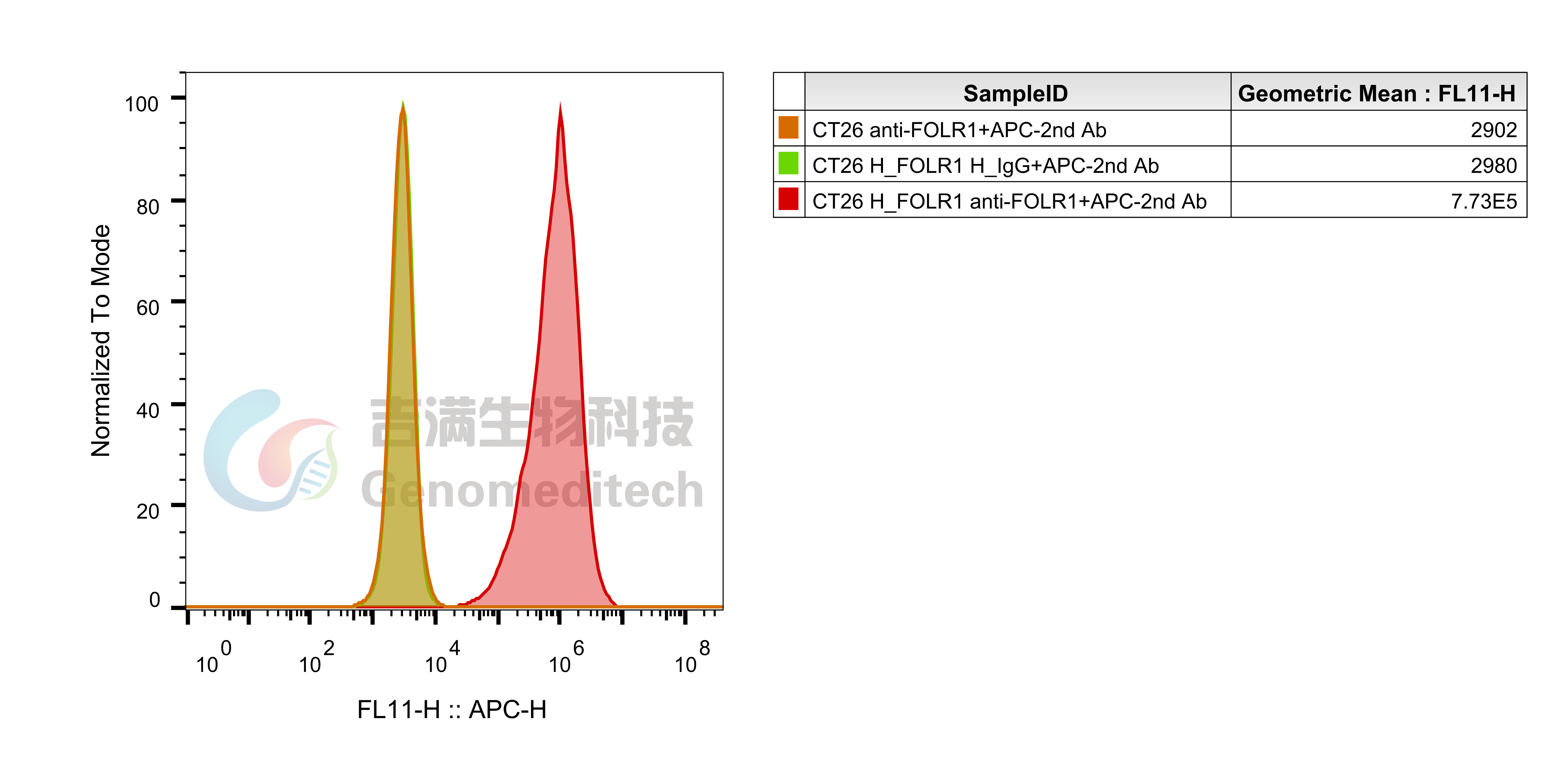 H_FOLR1 CT26 Cell Line (Cat. GM-C32895) was determined by flow cytometry using Anti-FOLR1 hIgG1 Antibody(Mirvetuximab) (Cat. GM-27354AB).