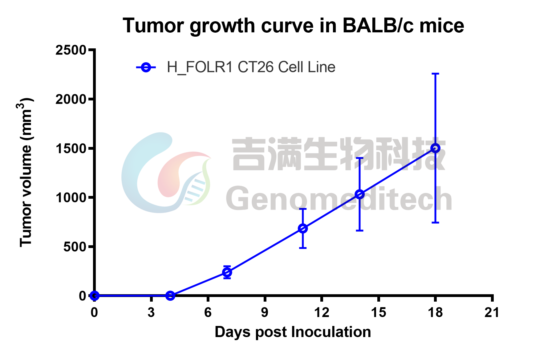 Tumor growth curves of H_FOLR1 CT26 Cells in BALB/c mice. H_FOLR1 CT26 cells (1×10^6 per mouse) were subcutaneously inoculated into BALB/c mice (female, 8 weeks old, n = 3). Tumor volume was measured twice per week and is presented as mean ± SEM.