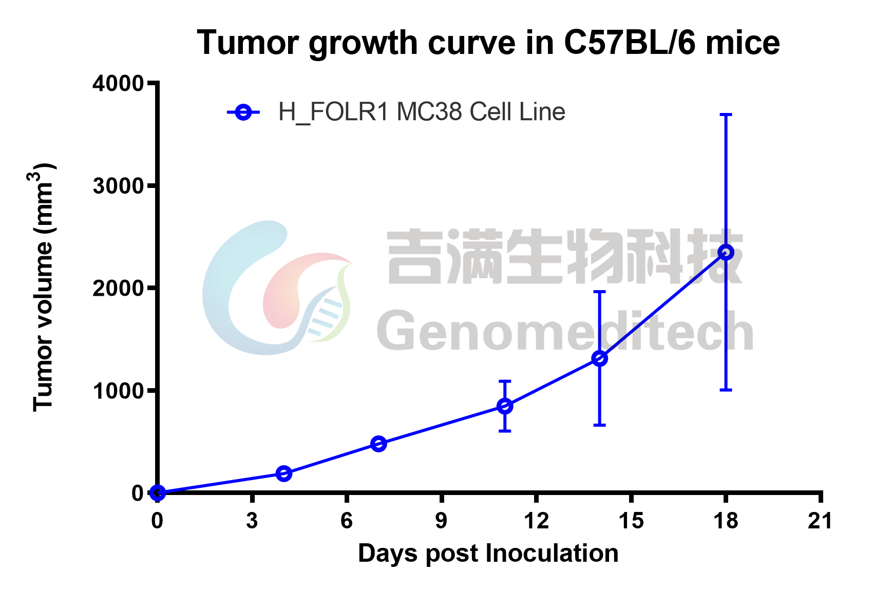 Tumor growth curves of H_FOLR1 MC38 in C57BL/6 mice. H_FOLR1 MC38 cells (1×10^6 per mouse) were subcutaneously inoculated into C57BL/6 mice (female, 8 weeks old, n = 3). Tumor volume was measured twice per week and is presented as mean ± SEM.