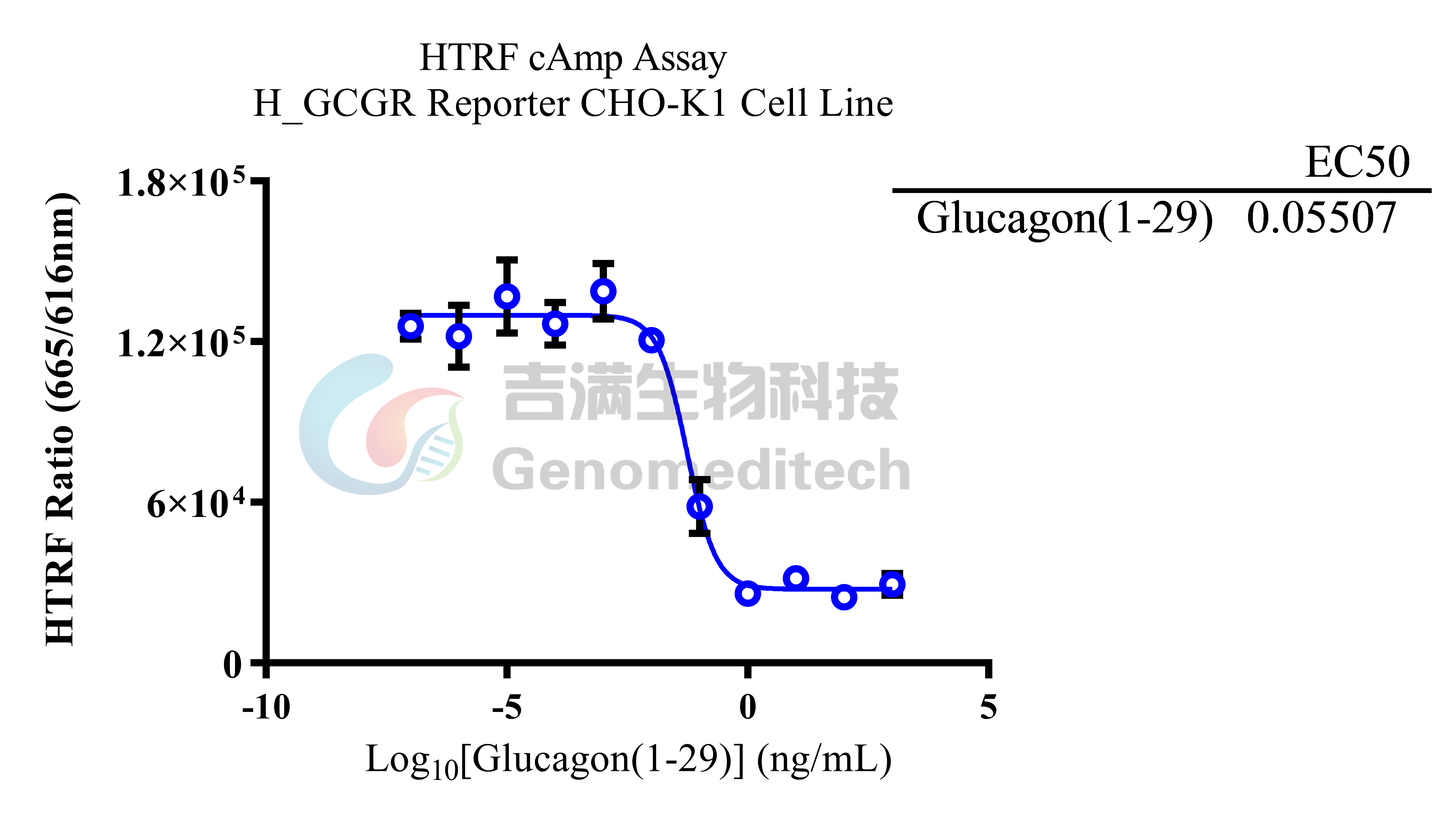 H_GCGR Reporter CHO-K1 cells were seeded at a density of 7500 cells per well in white 384‑well microplates (5 µL per well). Gradient‑diluted human  Glucagon (1-29) solutions were then added, and the cells were incubated at room temperature for 30 minutes. The HTRF cAMP Gs Dynamic Detection Kit (Revvity, Cat. No. 62AM4PEB) was used according to the manufacturer’s instructions. Fluorescence signals were measured using a Molecular Devices i3x multi‑mode plate reader with excitation at 340 nm and emissions detected at 616 nm and 665 nm. The data were expressed as the 665 nm/616 nm × 100,000 (HTRF Ratio) and used to calculate the EC50 value.