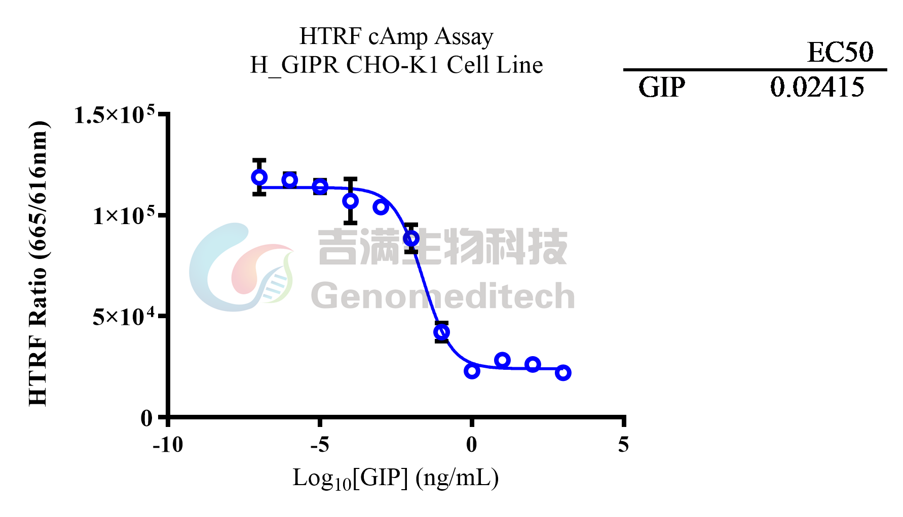 H_GIPR CHO‑K1 cells were seeded at a density of 7500 cells per well in white 384‑well microplates (5 µL per well). Gradient‑diluted human GIP solutions were then added, and the cells were incubated at room temperature for 30 minutes. The HTRF cAMP Gs Dynamic Detection Kit (Revvity, Cat. No. 62AM4PEB) was used according to the manufacturer’s instructions. Fluorescence signals were measured using a Molecular Devices i3x multi‑mode plate reader with excitation at 340 nm and emissions detected at 616 nm and 665 nm. The data were expressed as the 665 nm/616 nm × 100,000 (HTRF Ratio) and used to calculate the EC50 value.
