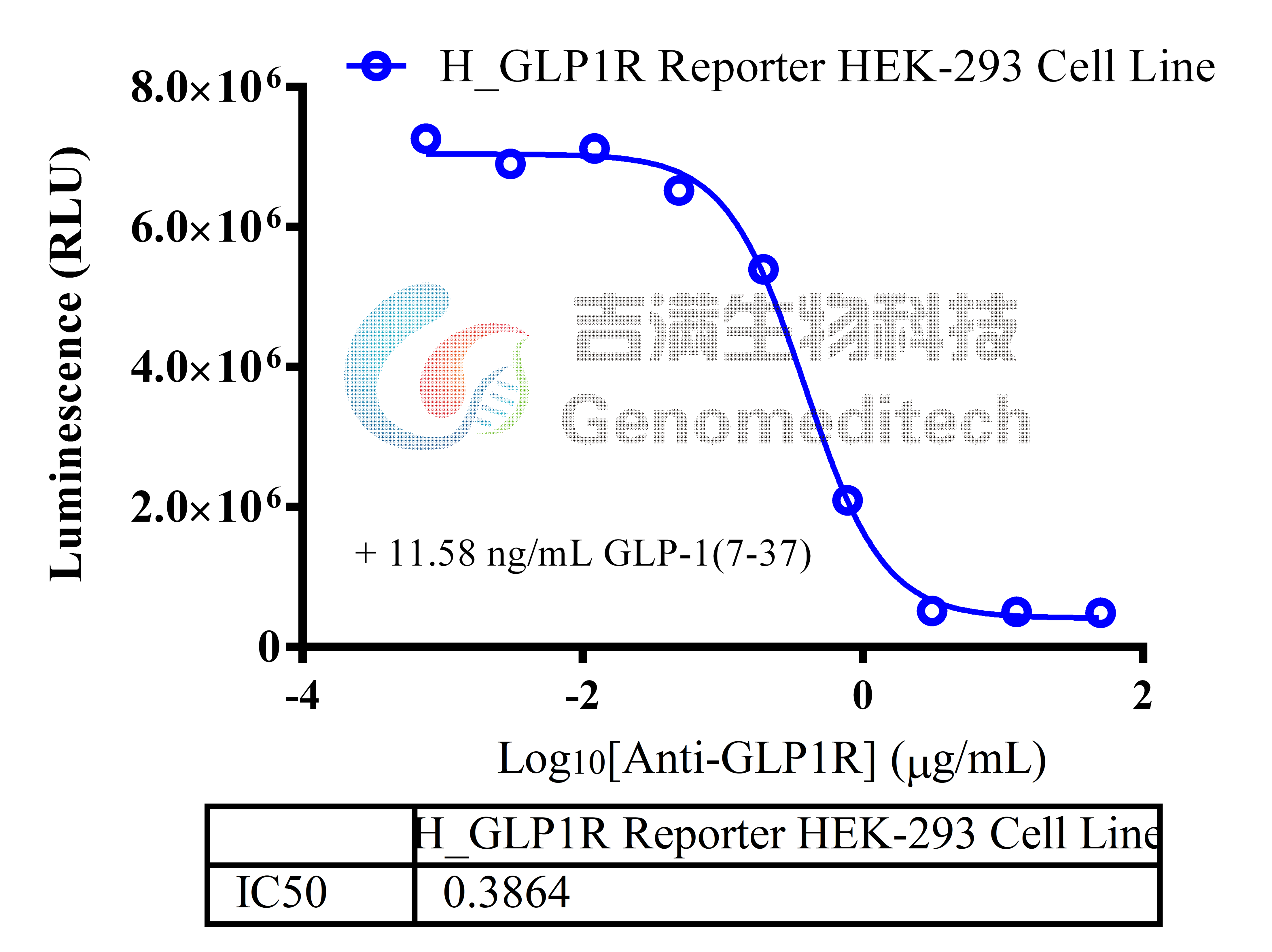 Response to Anti-GLP1R hIgG1 Antibody(mAb-36986). Begin by preparing the H_GLP1R Reporter HEK-293 Cell Line (Cat. GM-C25537) at a density of 1.5E4 cells/well in a 96-well format. The serial dilutions of Anti-GLP1R hIgG1 Antibody(mAb-36986) (Cat. GM-51168AB) were incubated with 11.58 ng/mL of GLP-1(7-37) (MCE/HY-P0055A) for 1 hour in assay buffer (DMEM + 1% FBS + 1% P.S). After pre-incubation, the mixture was added to the H_GLP1R Reporter HEK-293 Cell Line and incubated for 6 hours. Firefly luciferase activity is then measured using the Luciferase Reporter Assay Kit (Genomeditech). The results indicated a maximum blocking fold of approximately [15.9]. Data are shown by drug mass concentration.