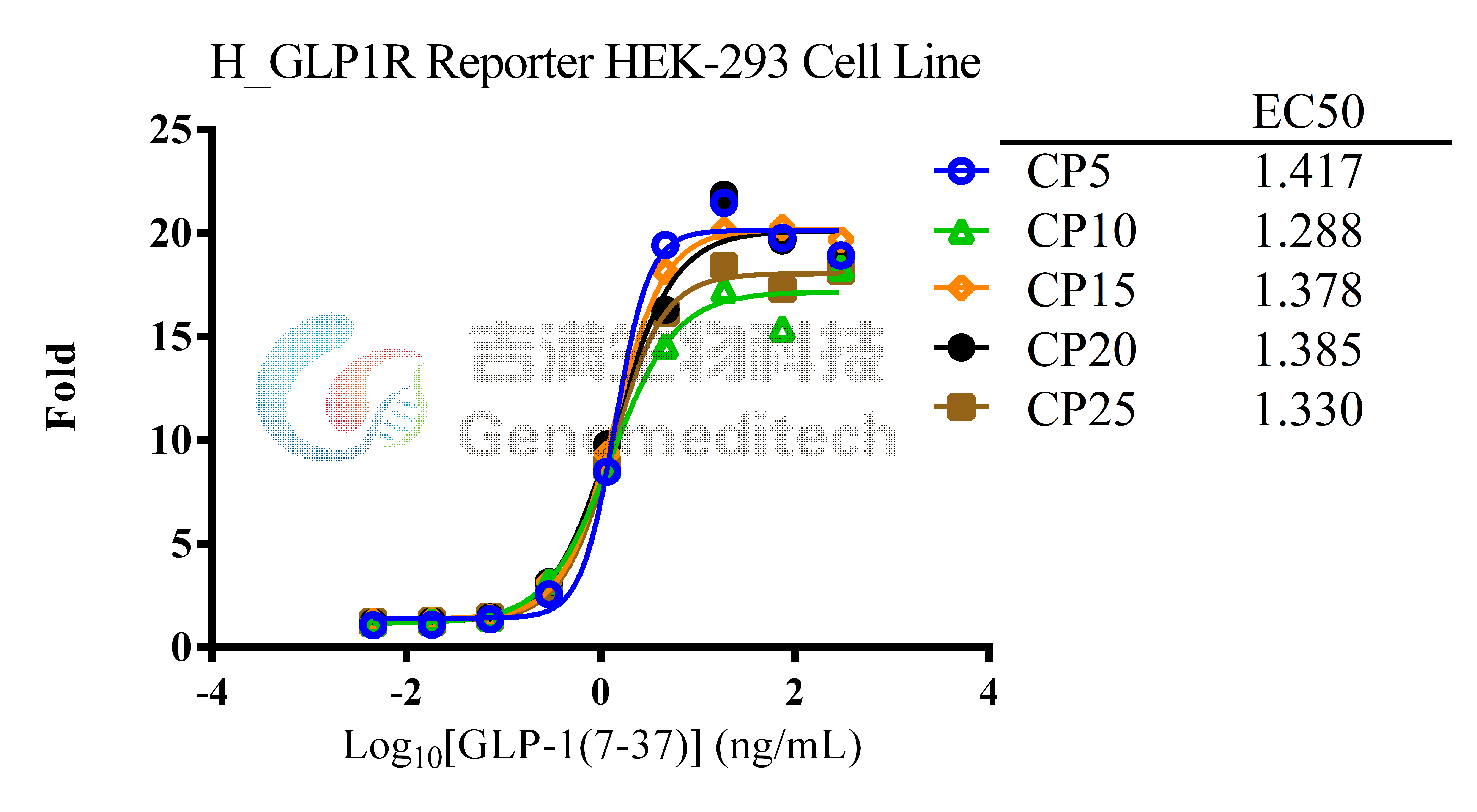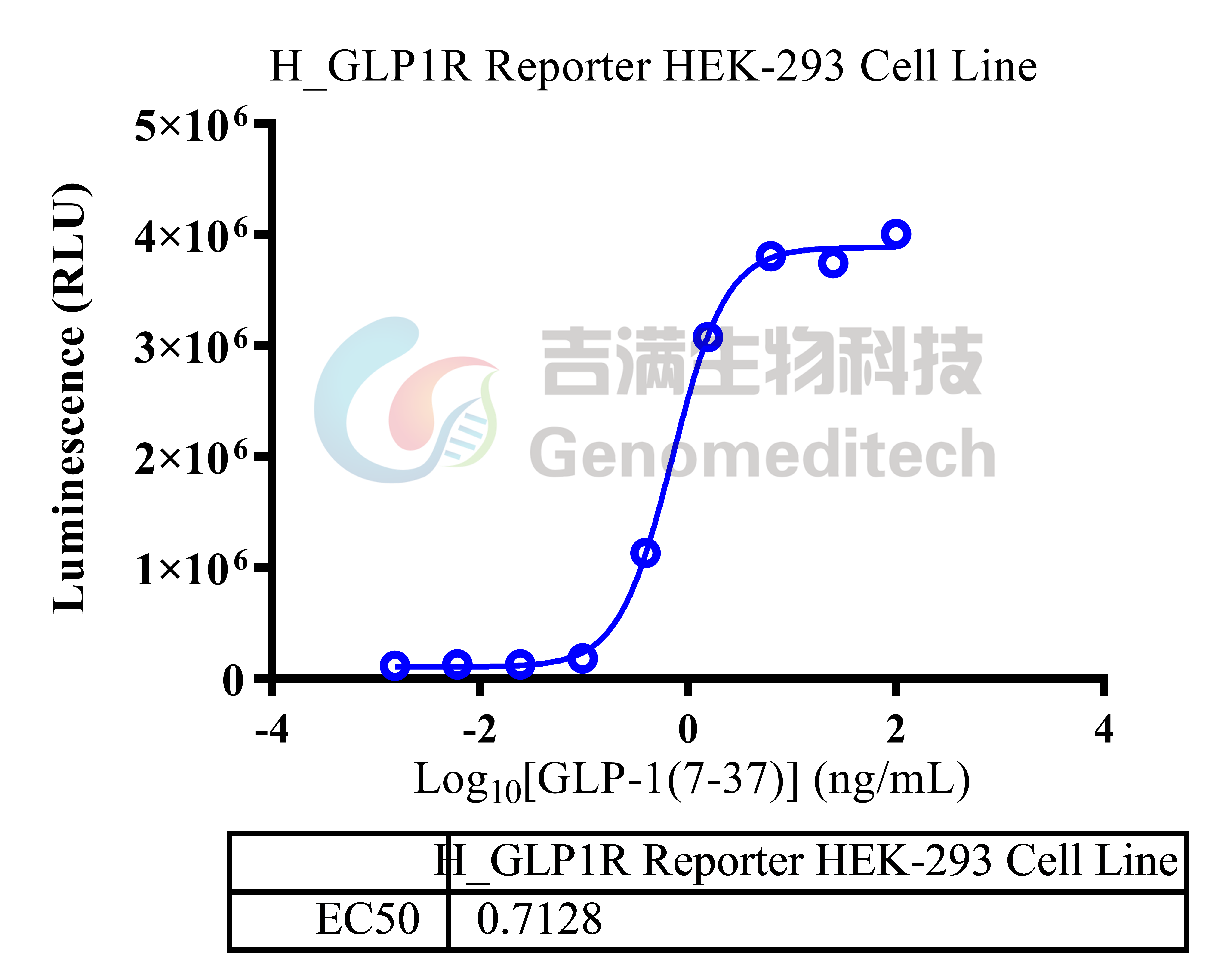 Response to GLP-1(7-37). The H_GLP1R Reporter HEK-293 Cell Line (Cat. GM-C25537) at a concentration of 1.5E4 cells/well (96-well format) was stimulated with serial dilutions of GLP-1(7-37) (MCE/HY-P0055A) in assay buffer (DMEM + 1% FBS + 1% P.S) for 7 hours. The firefly luciferase activity was measured using the Luciferase Reporter Assay Kit (Genomeditech). The maximum induction fold was approximately [29.0]. Data are shown by drug mass concentration .