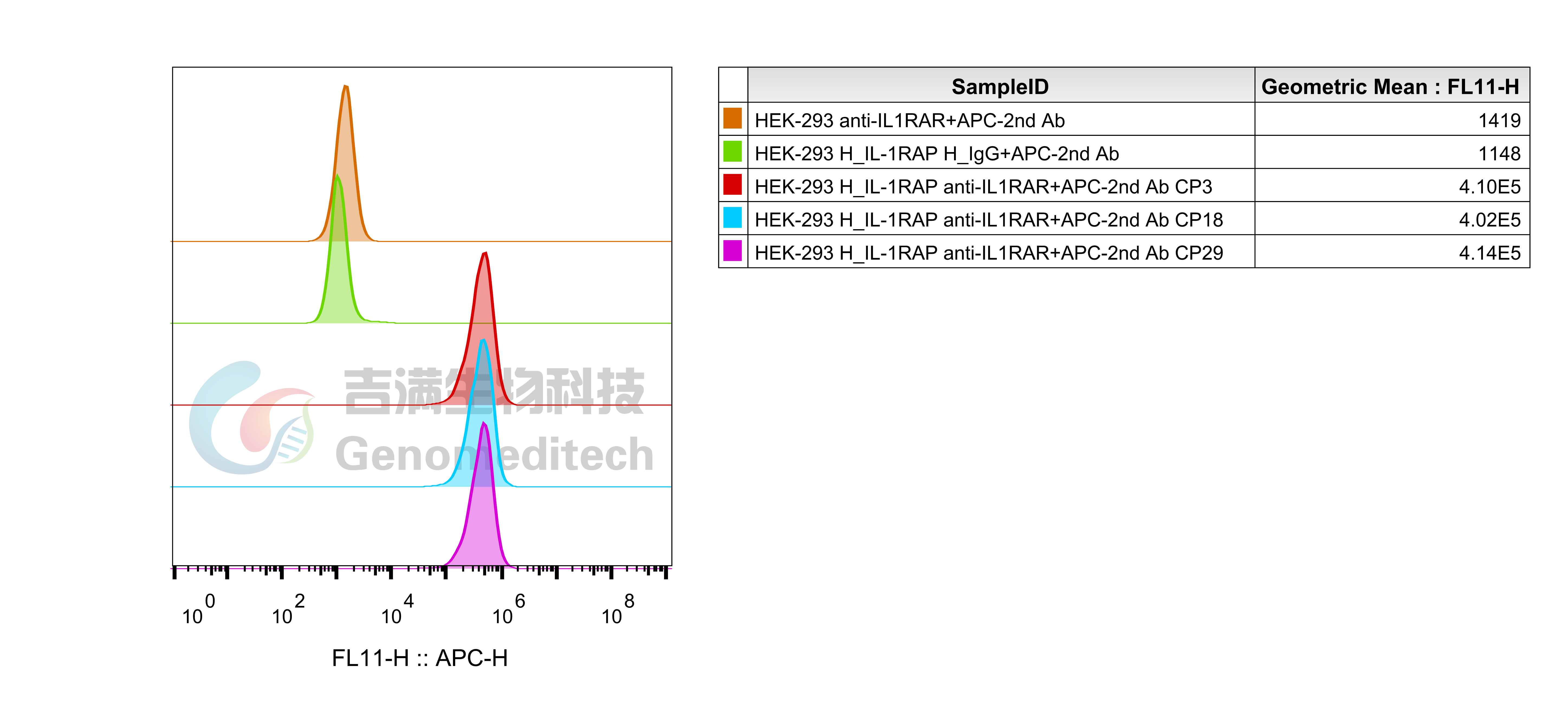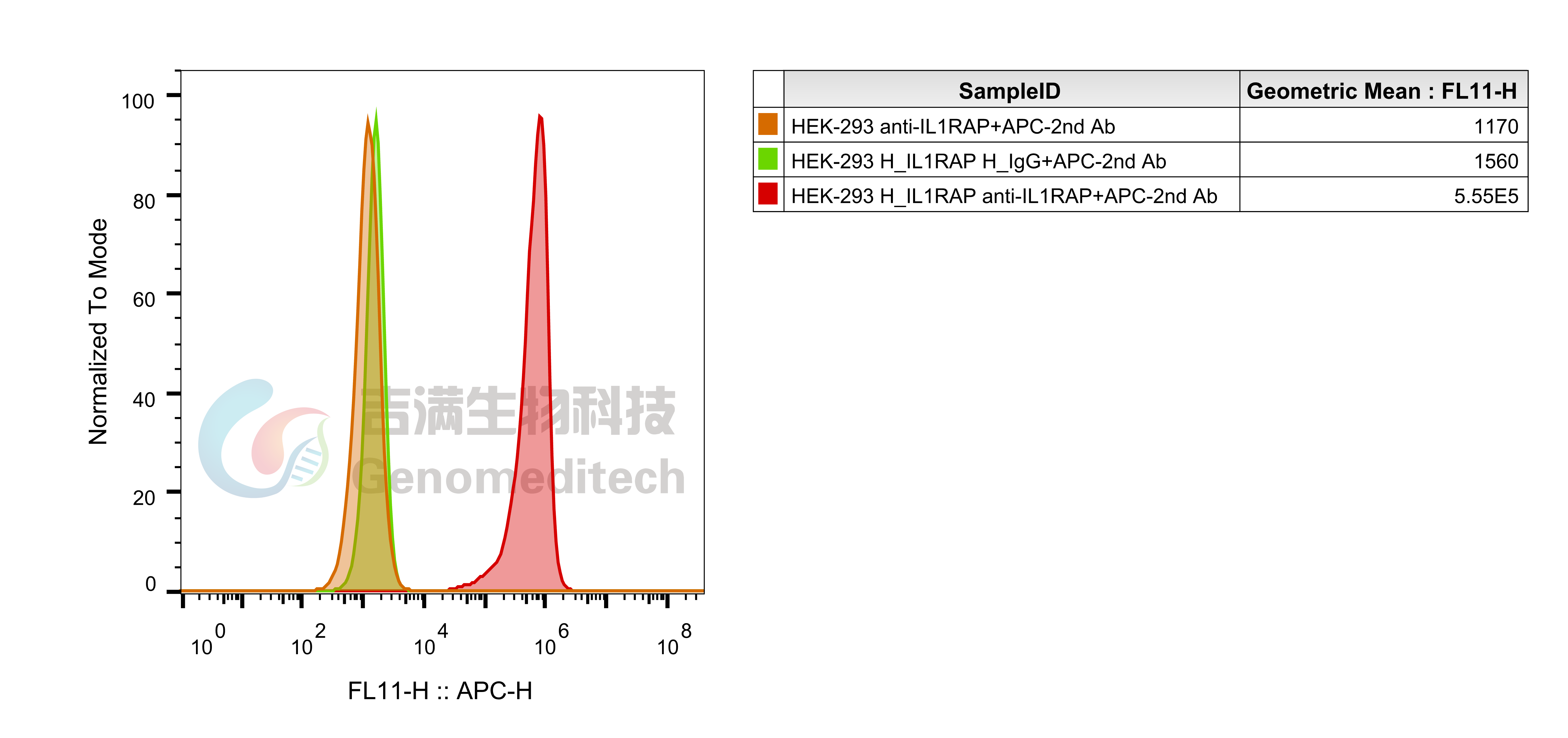 H_IL1RAP HEK-293 Cell Line (Cat. GM-C41714) was determined by flow cytometry using Anti-IL1RAP hIgG1 Antibody (Nadunolimab) (Cat. GM-88204AB).