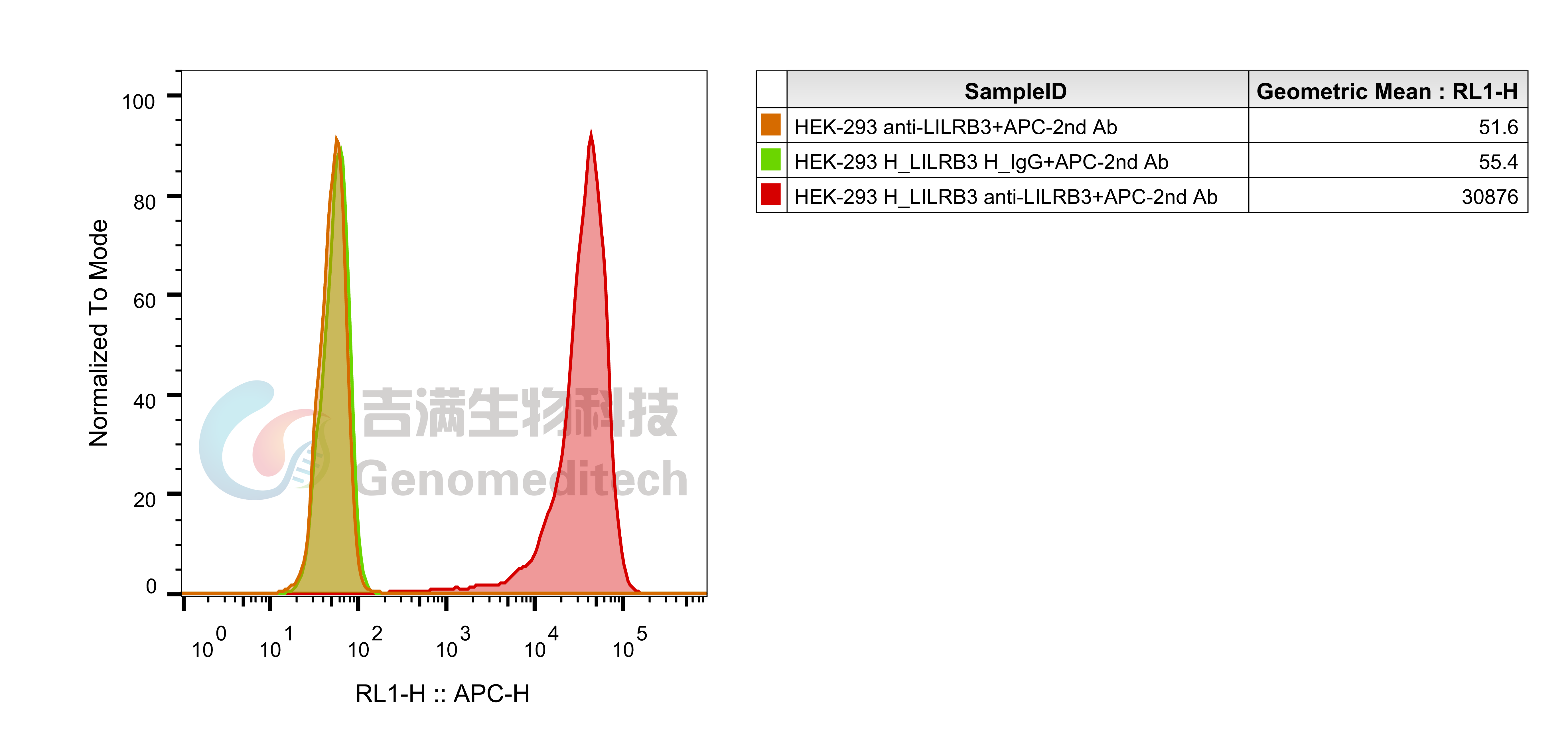 H_LILRB3(ILT5) HEK-293 Cell Line was determined by flow cytometry using Anti-H_LILRB3 hIgG1 Antibody (Genomeditech/GM-27367AB).