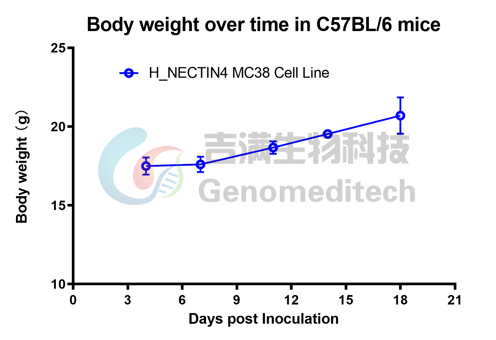 Body weight changes after implantation of H_NECTIN4 MC38 in C57BL/6 mice. Under the same conditions, body weight was measured twice per week and is presented as mean ± SEM.