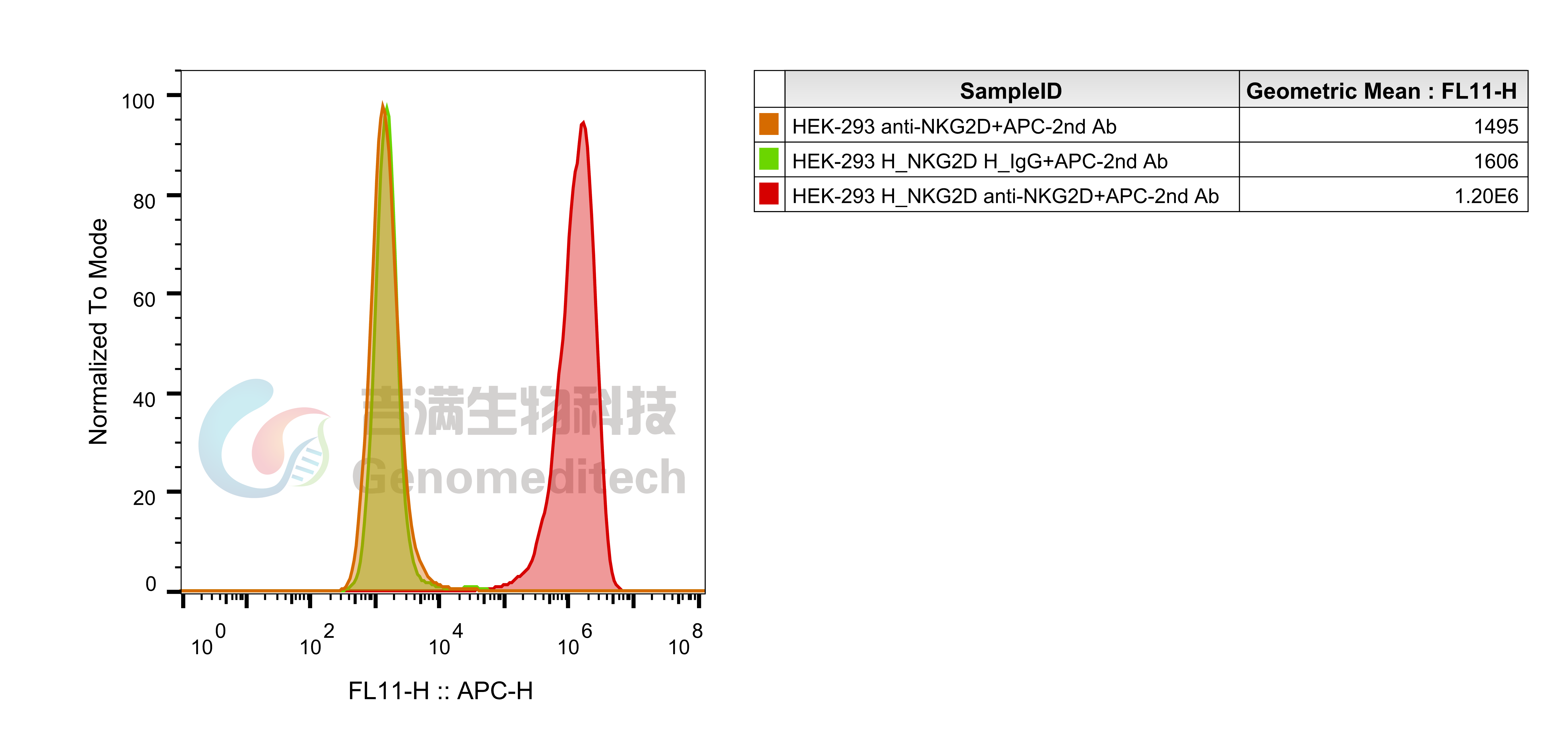 H_NKG2D HEK-293 Cell Line (Cat. GM-C27816) was determined by flow cytometry using Anti-NKG2D hIgG1 Antibody(A49MI) (Cat. GM-52535AB).