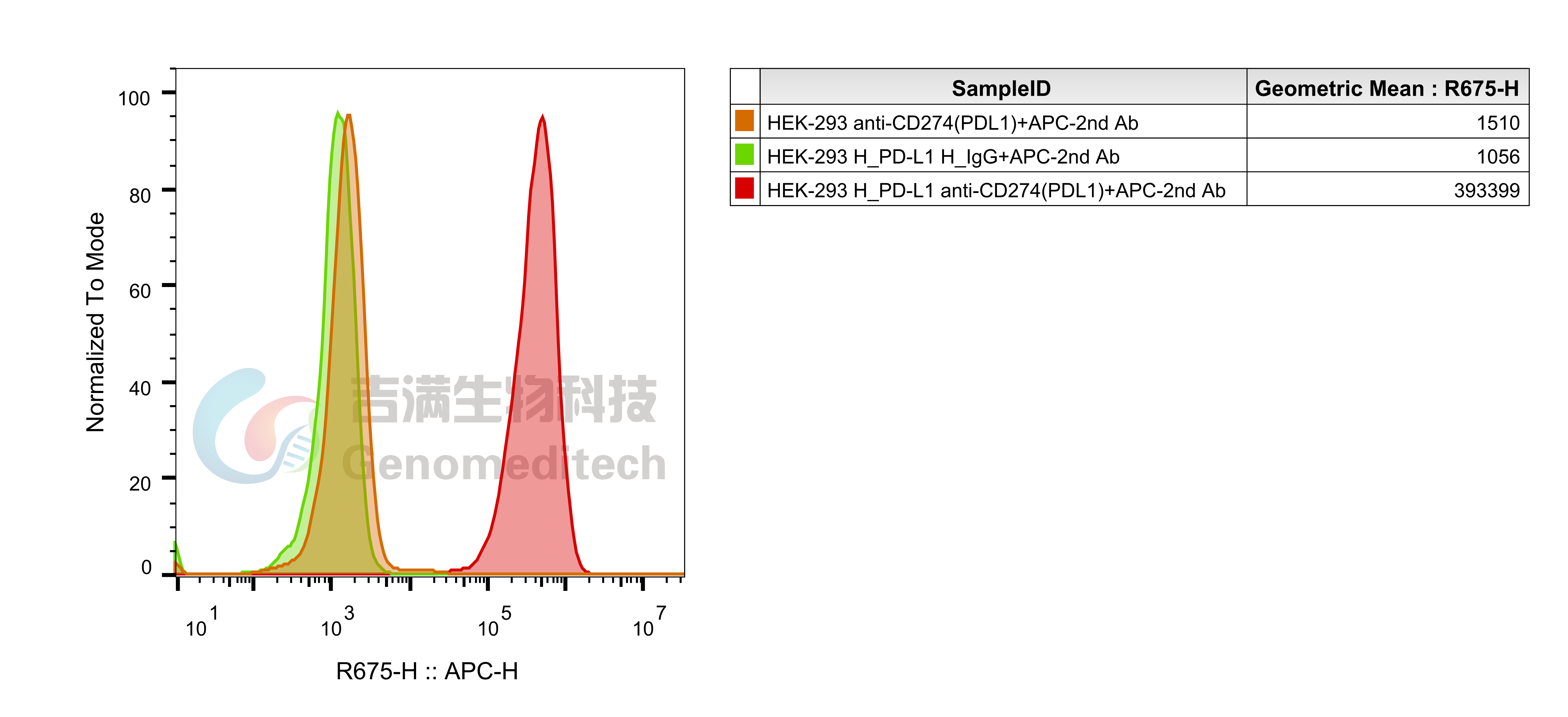 H_PD-L1 HEK-293 Cell Line (Cat. GM-C11722) was determined by flow cytometry using Anti-H_CD274(PDL1) hIgG1 Antibody(Atezolizumab) (Cat. GM-31740AB).