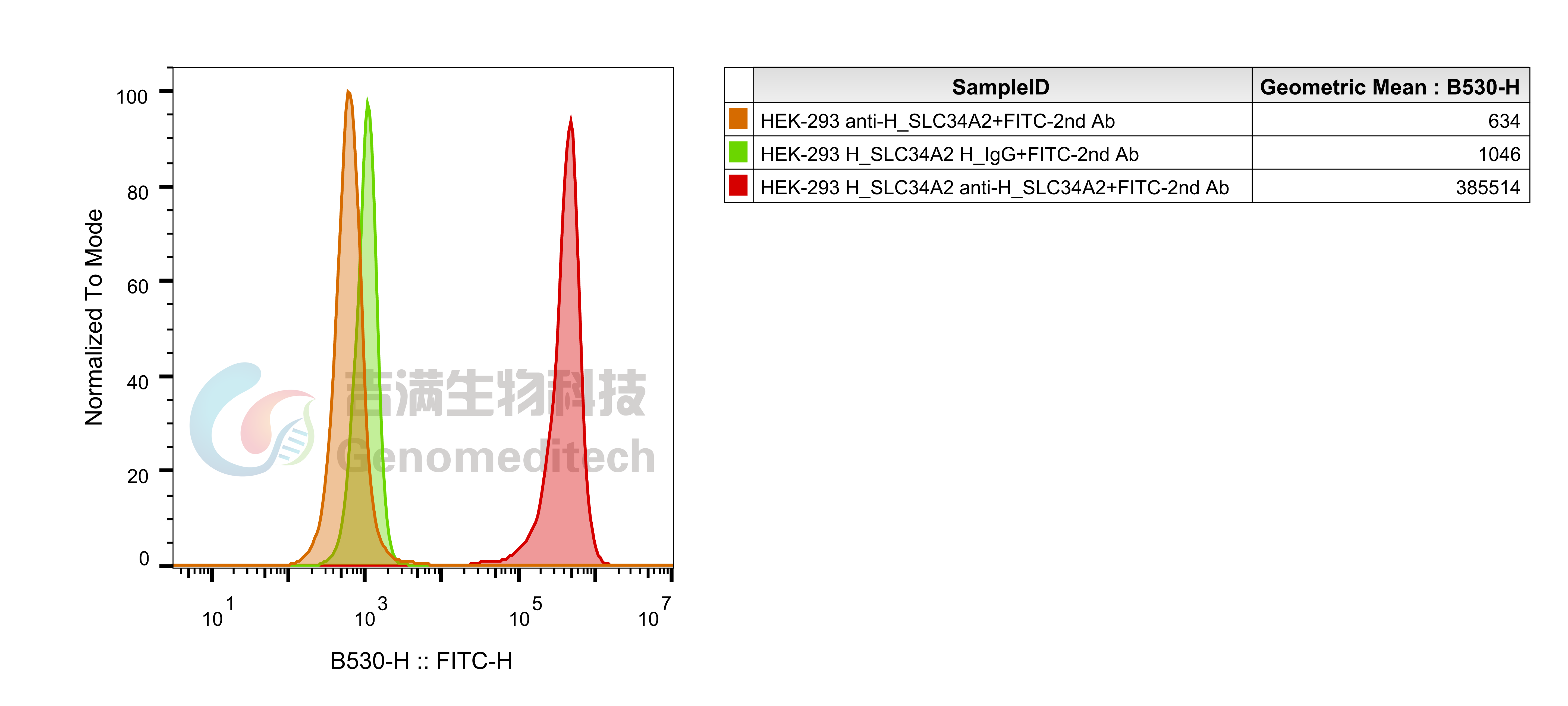 H_SLC34A2 HEK-293 Cell Line was determined by flow cytometry using Anti-H_SLC34A2 hIgG1 Antibody (Genomeditech/GM-26828AB).