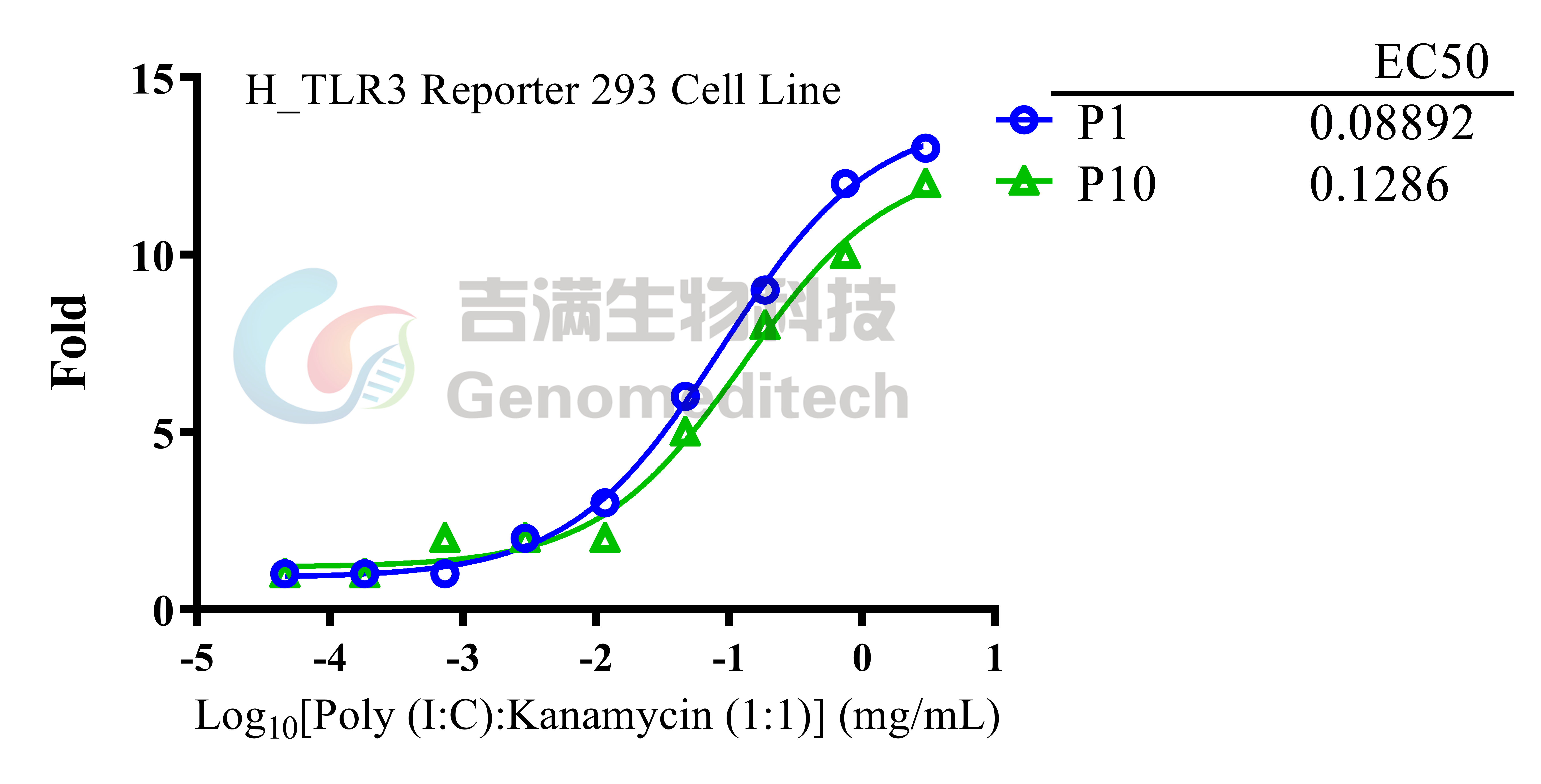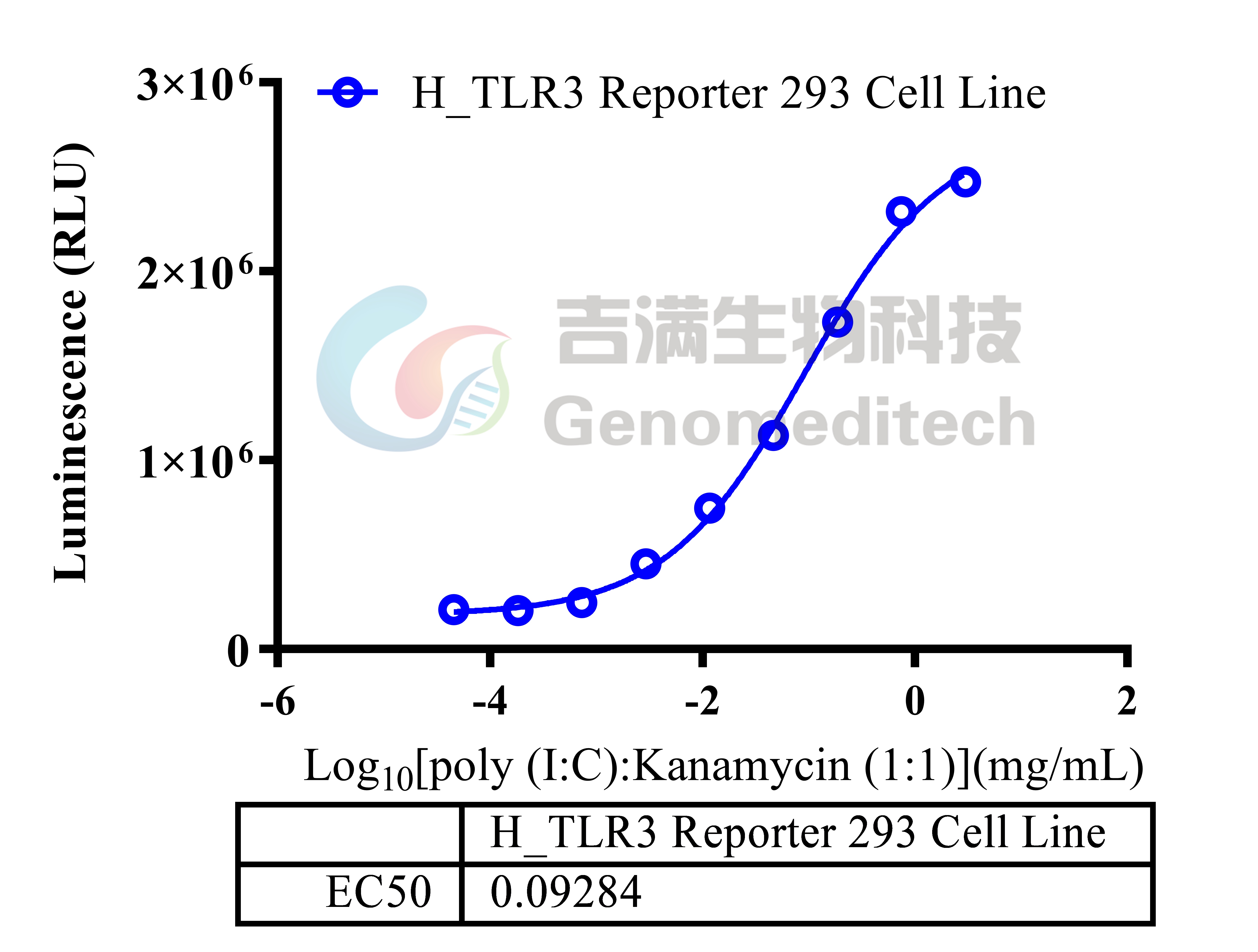 Response to Poly (I:C). H_TLR3 Reporter HEK-293 Cell Line (Cat. GM-C27577) at a concentration of 1.5E4 cells/well (96-well format) was stimulated with serial dilutions of Poly (I:C):Kanamycin (1:1) (MedChemExpress/HY-107202A) in assay buffer (EMEM + 1% FBS + 1% P.S) for 16 hours. The firefly luciferase activity was measured using the Luciferase Reporter Assay Kit (Genomeditech). The maximum induction fold was approximately [9.0]. Data are shown by drug mass concentration.
