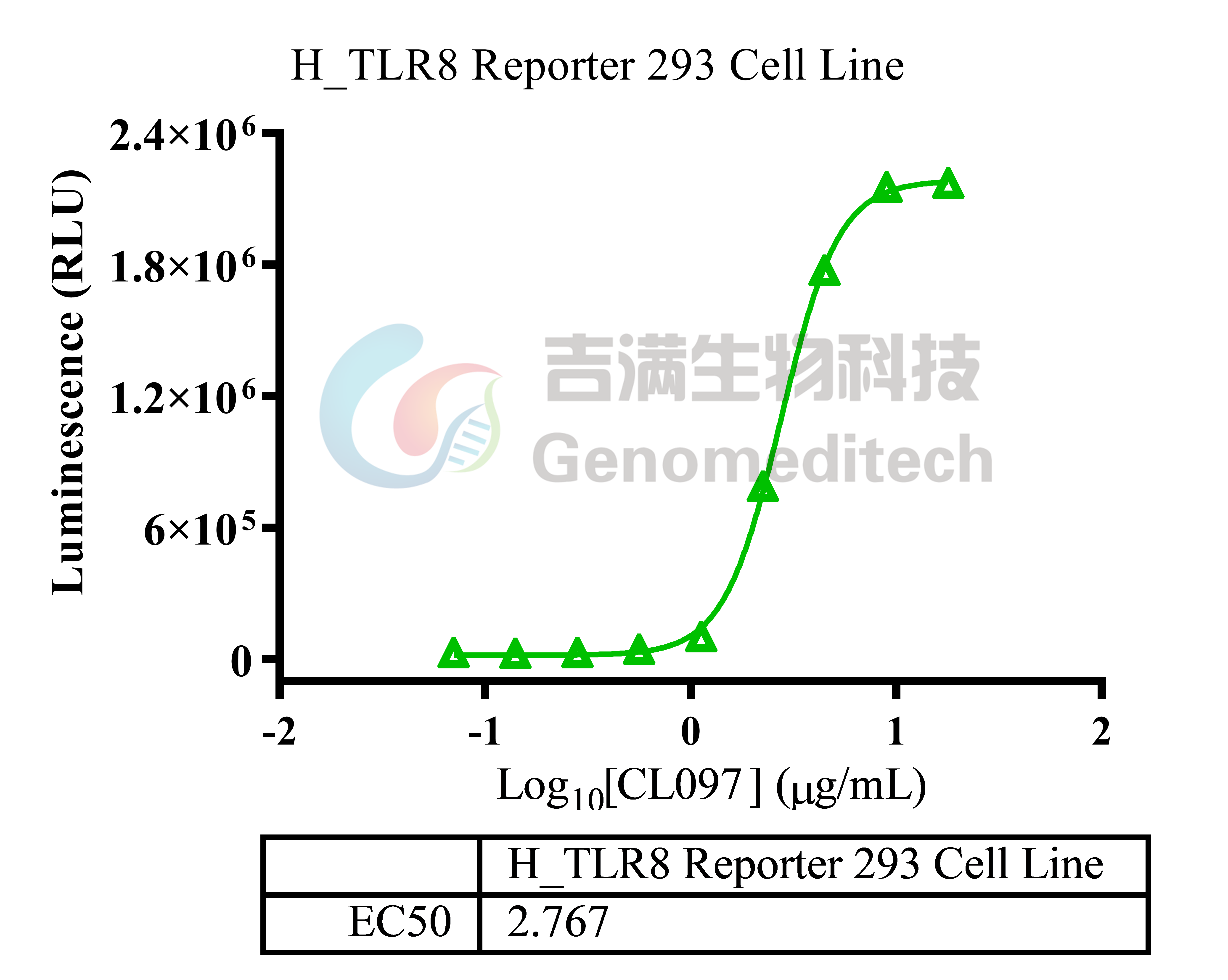 Response to CL097. The H_TLR8 Reporter 293 Cell Line (Cat. GM-C15427) at a concentration of 2E4 cells/well (96-well format) was stimulated with serial dilutions of CL097 (InvivoGen/tlrl-c97) in assay buffer (EMEM + 1% FBS + 1% P.S) for 7 hours. The firefly luciferase activity was measured using the Luciferase Reporter Assay Kit (Genomeditech). The maximum induction fold was approximately [79.4]. Data are shown by drug mass concentration.