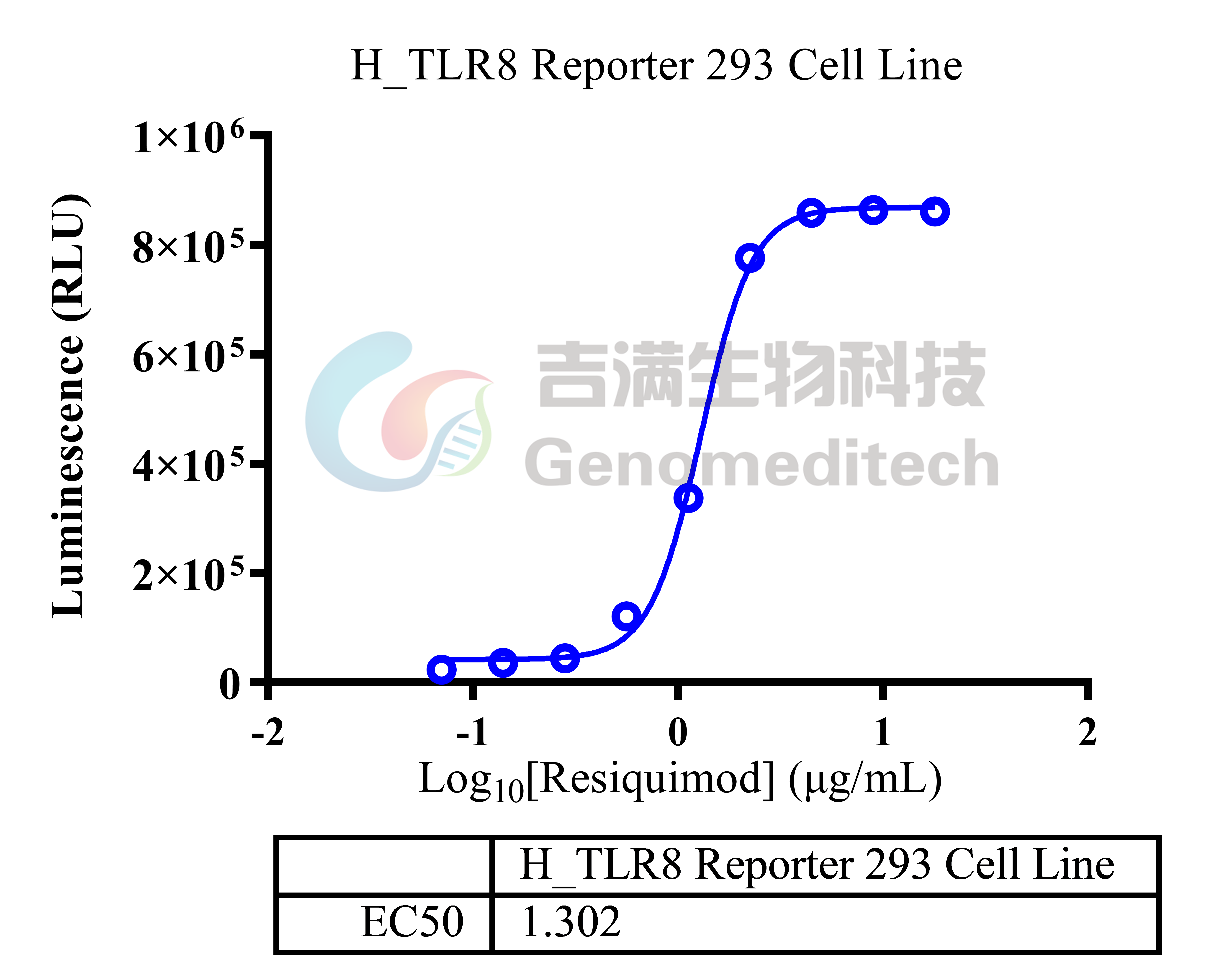 Response to Resiquimod. The H_TLR8 Reporter 293 Cell Line (Cat. GM-C15427) at a concentration of 2E4 cells/well (96-well format) was stimulated with serial dilutions of Resiquimod (MCE/HY-13740) in assay buffer (EMEM + 1% FBS + 1% P.S) for 7 hours. The firefly luciferase activity was measured using the Luciferase Reporter Assay Kit (Genomeditech). The maximum induction fold was approximately [38.9]. Data are shown by drug mass concentration.