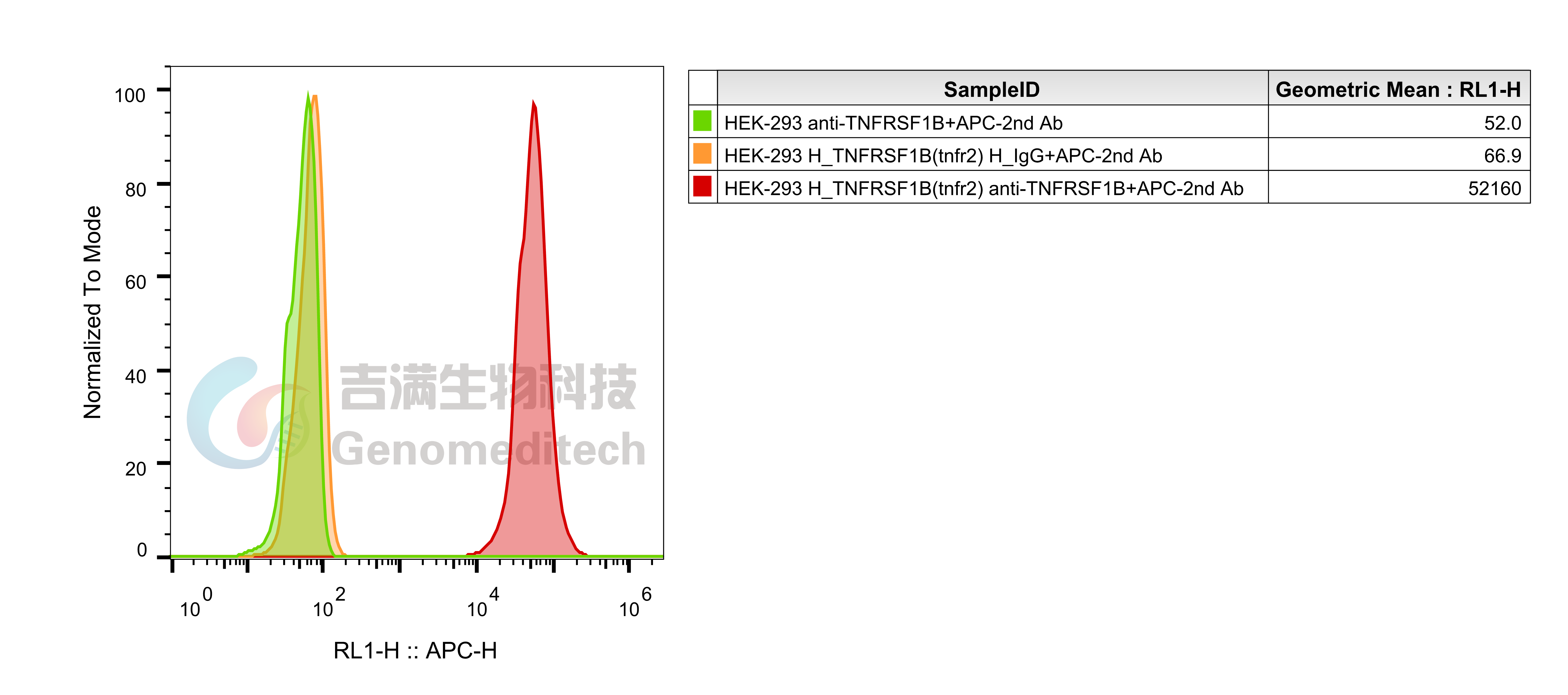 H_TNFRSF1B(TNFR2) HEK-293 Cell Line was determined by flow cytometry using Anti-H_TNFRSF1B(TNFR2) hIgG1 Antibody (Genomeditech/GM-49245AB).