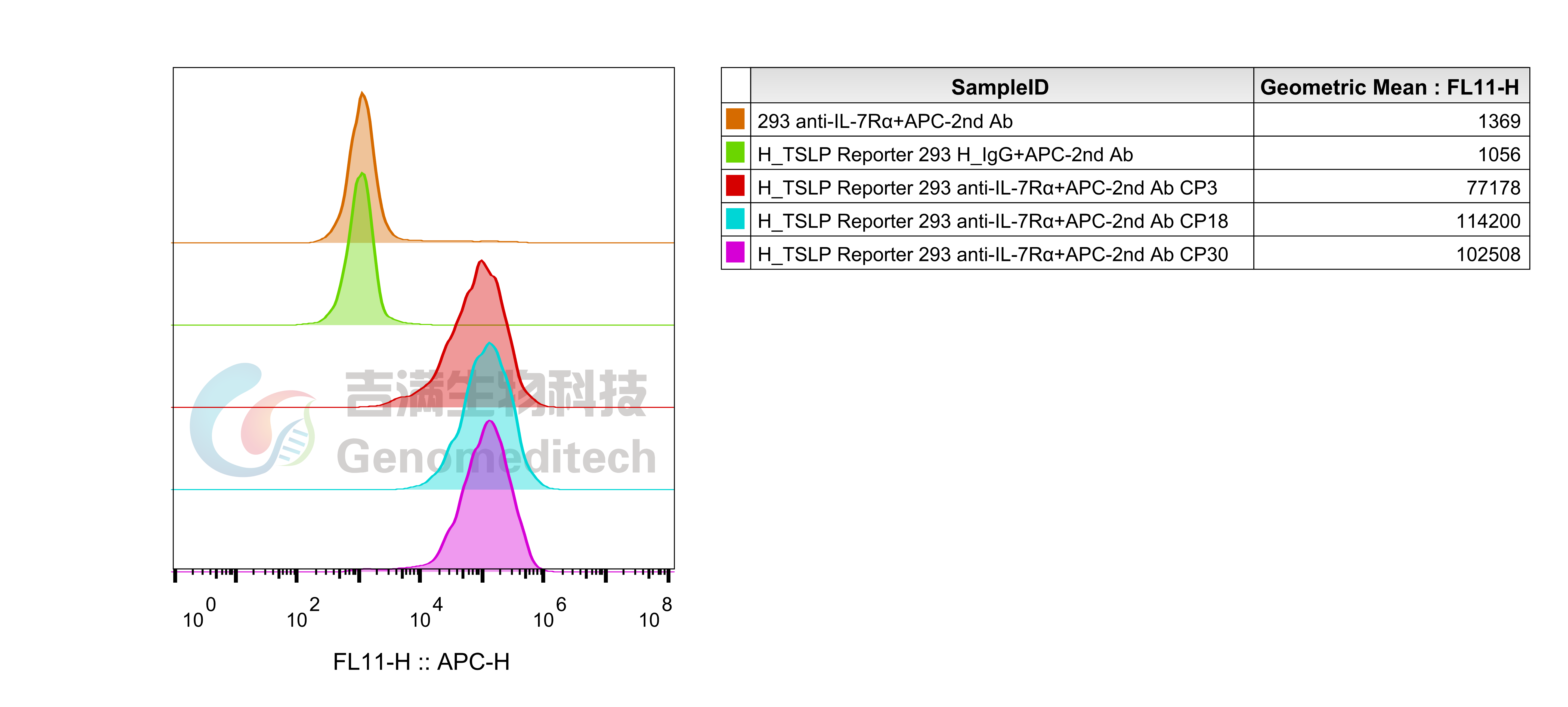 The passage stability of the H_TSLP Reporter 293 Cell Line (Cat. GM-C26459) was determined by flow cytometry using Anti-H_IL-7Rα hIgG4 Antibody(lusvertikimab) (Cat. GM-32425AB).