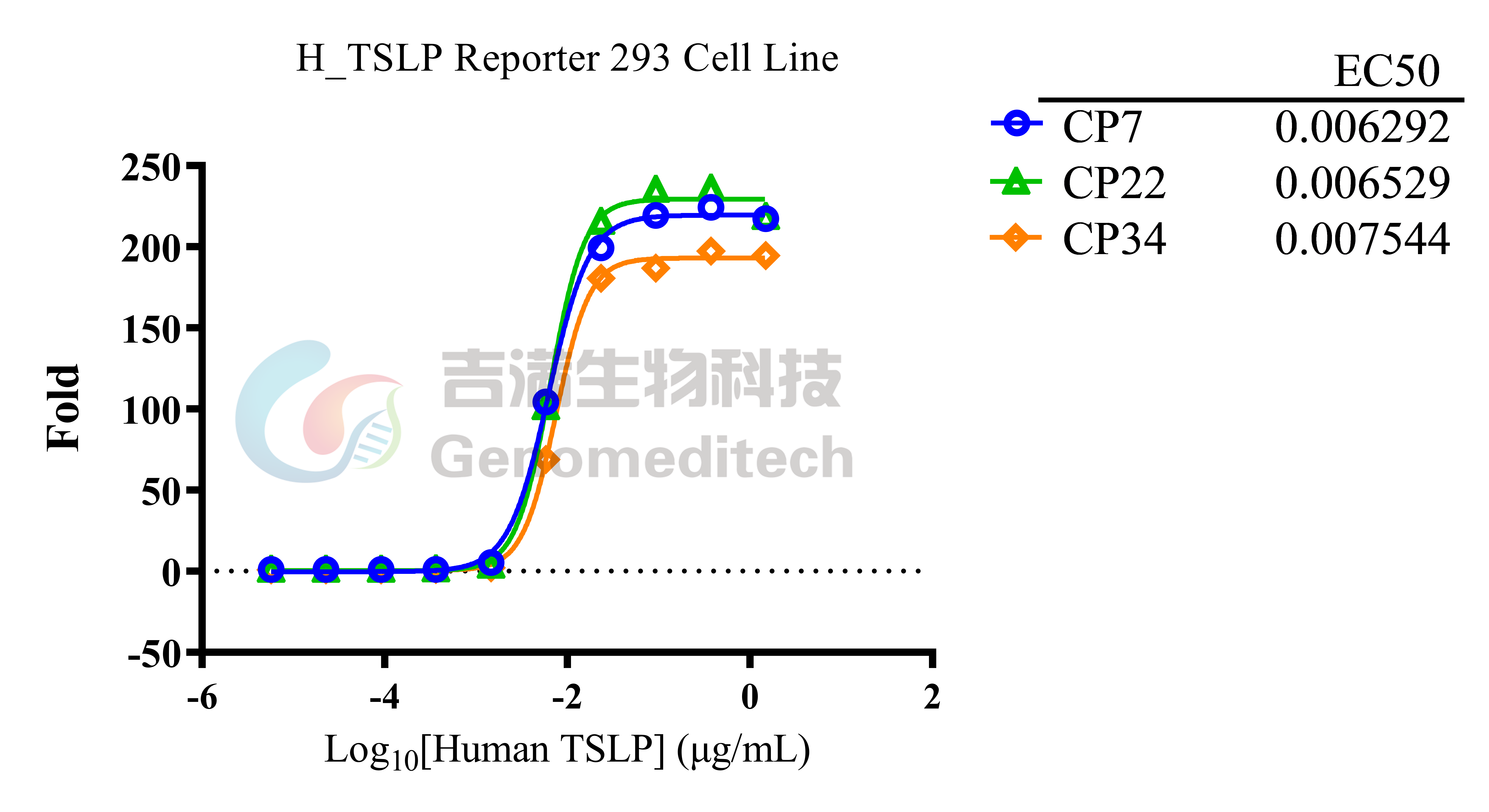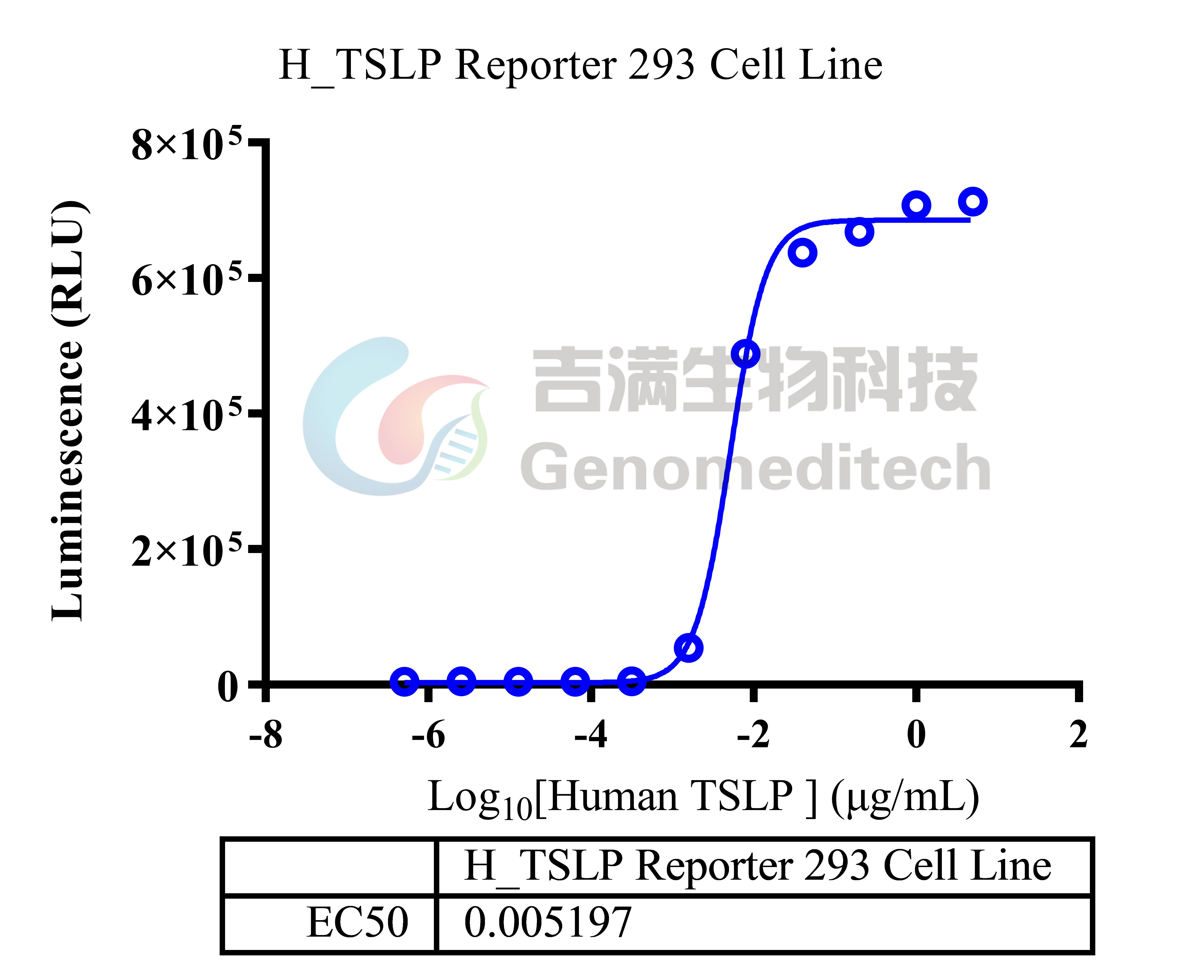 Response to Human TSLP protein. The H_TSLP Reporter 293 Cell Line (Cat. GM-C26459) at a concentration of 1.5E4 cells/well (96-well format) was stimulated with serial dilutions of Human TSLP Protein; His Tag (Cat. GM-87654RP) in assay buffer (DMEM + 1% FBS + 1% P.S) for 6 hours. The firefly luciferase activity was measured using the Luciferase Reporter Assay Kit (Genomeditech). The maximum induction fold was approximately [147.5]. Data are shown by drug mass concentration.