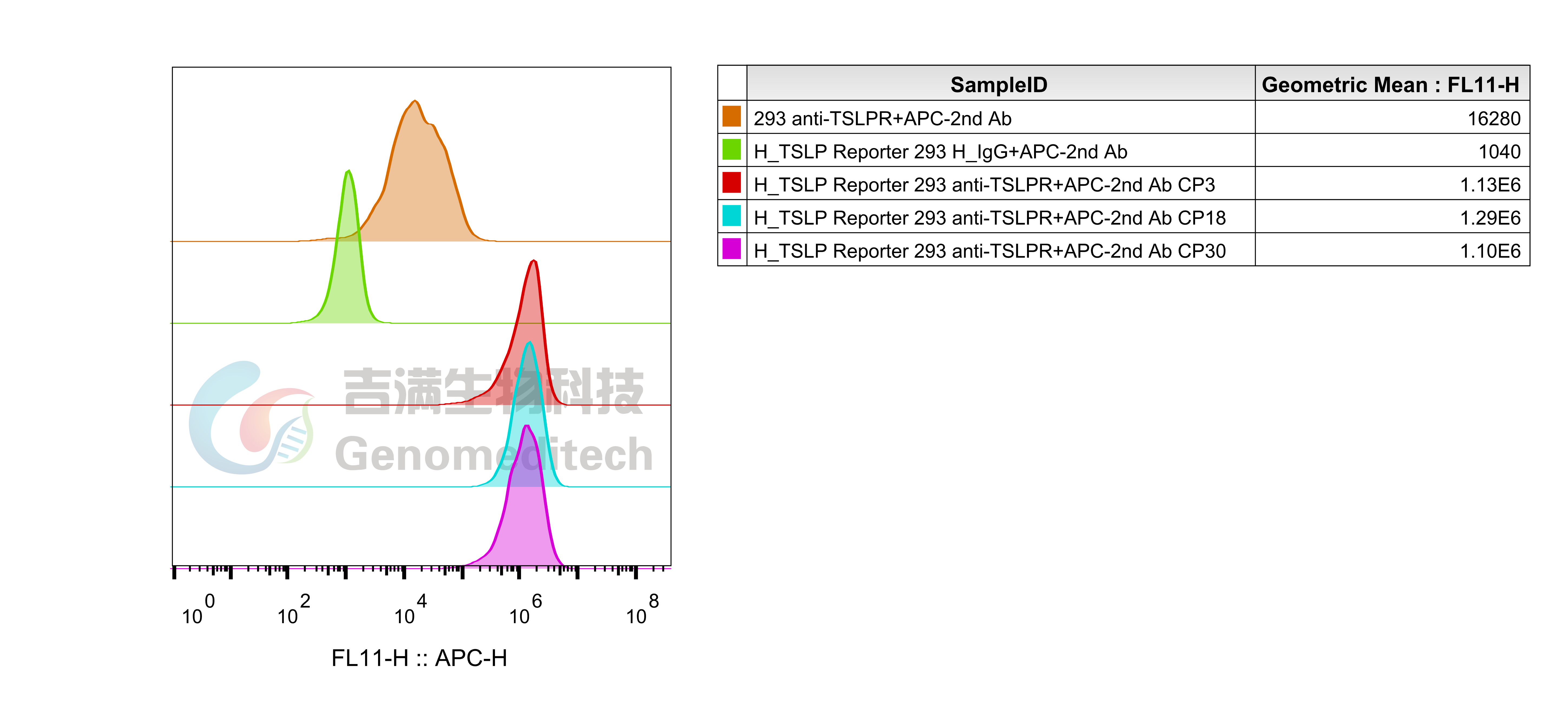 The passage stability of the H_TSLP Reporter 293 Cell Line (Cat. GM-C26459) was determined by flow cytometry using Anti-H_TSLPR hIgG1 Antibody (Cat. GM-31018AB).