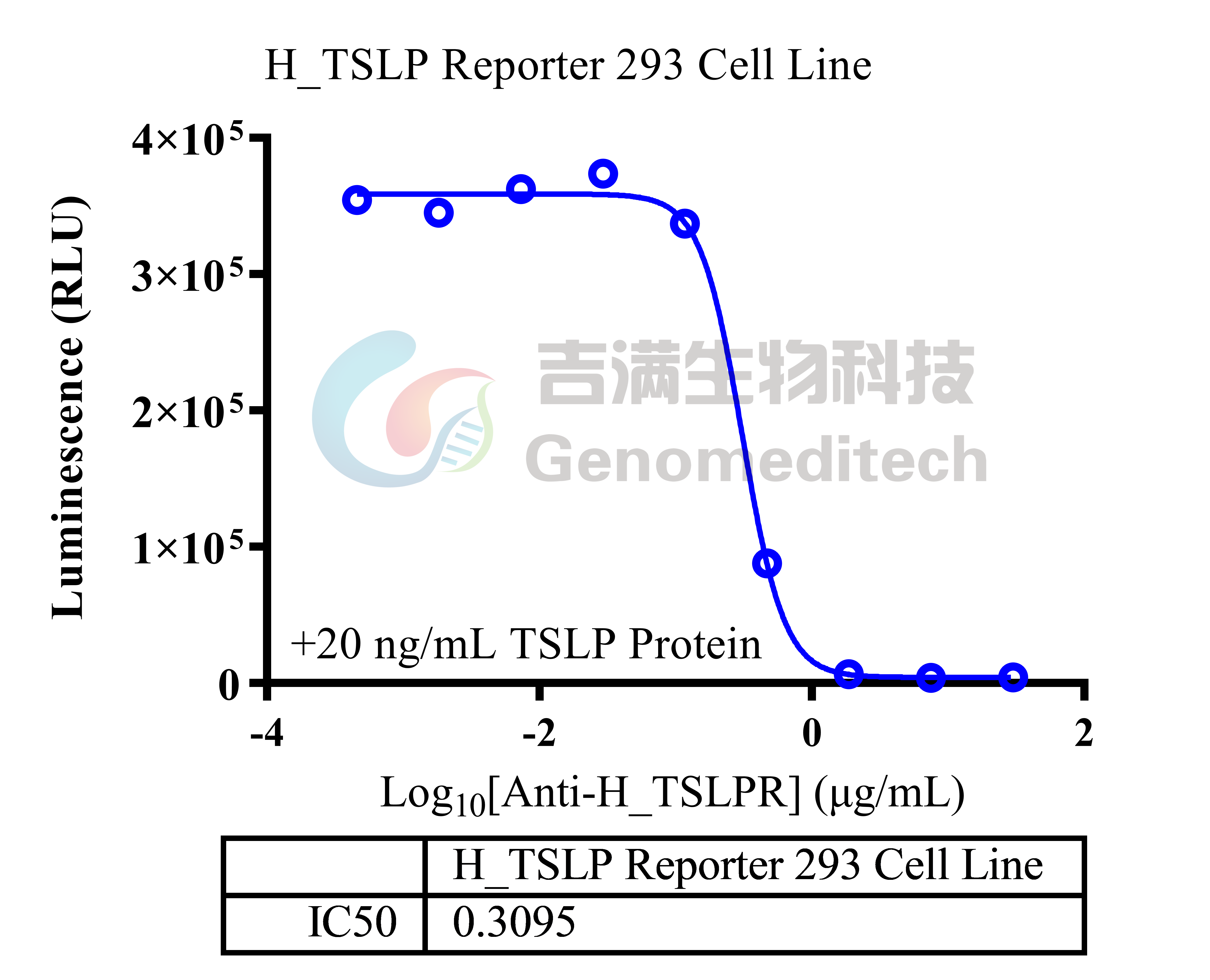 Response to Anti-H_TSLPR hIgG1 Antibody. Serial dilutions of the Anti-H_TSLPR hIgG1 Antibody (Cat. GM-31018AB) was incubated with 1.5E4 cells/well of the H_TSLP Reporter 293 Cell Line (Cat. GM-C26459) in a 96-well plate for 1 hour in assay buffer (DMEM+1% FBS+1% P.S). Subsequently, the Human TSLP Protein (Cat. GM-87654RP) at a concentration of 2 ng/well was added, and the coculture proceeded for an additional 6 hours. Firefly luciferase activity was then measured using the Luciferase Reporter Assay Kit (Genomeditech). The results indicated maximum blocking folds of approximately [91.3]. Data are shown by drug mass concentration.