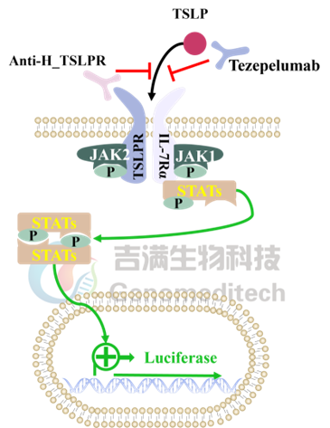 H_TSLP Reporter 293 Cell Line is a clonal stable 293 cell line constructed using lentiviral technology, constitutive expression of the human IL7RA gene and TSLPR gene, along with signal-dependent expression of a luciferase reporter gene. When the TSLP protein binds to the receptor, it activates downstream signaling pathways, leading to the expression of luciferase. Blockade antibodies can inhibit this signal transmission. The luciferase