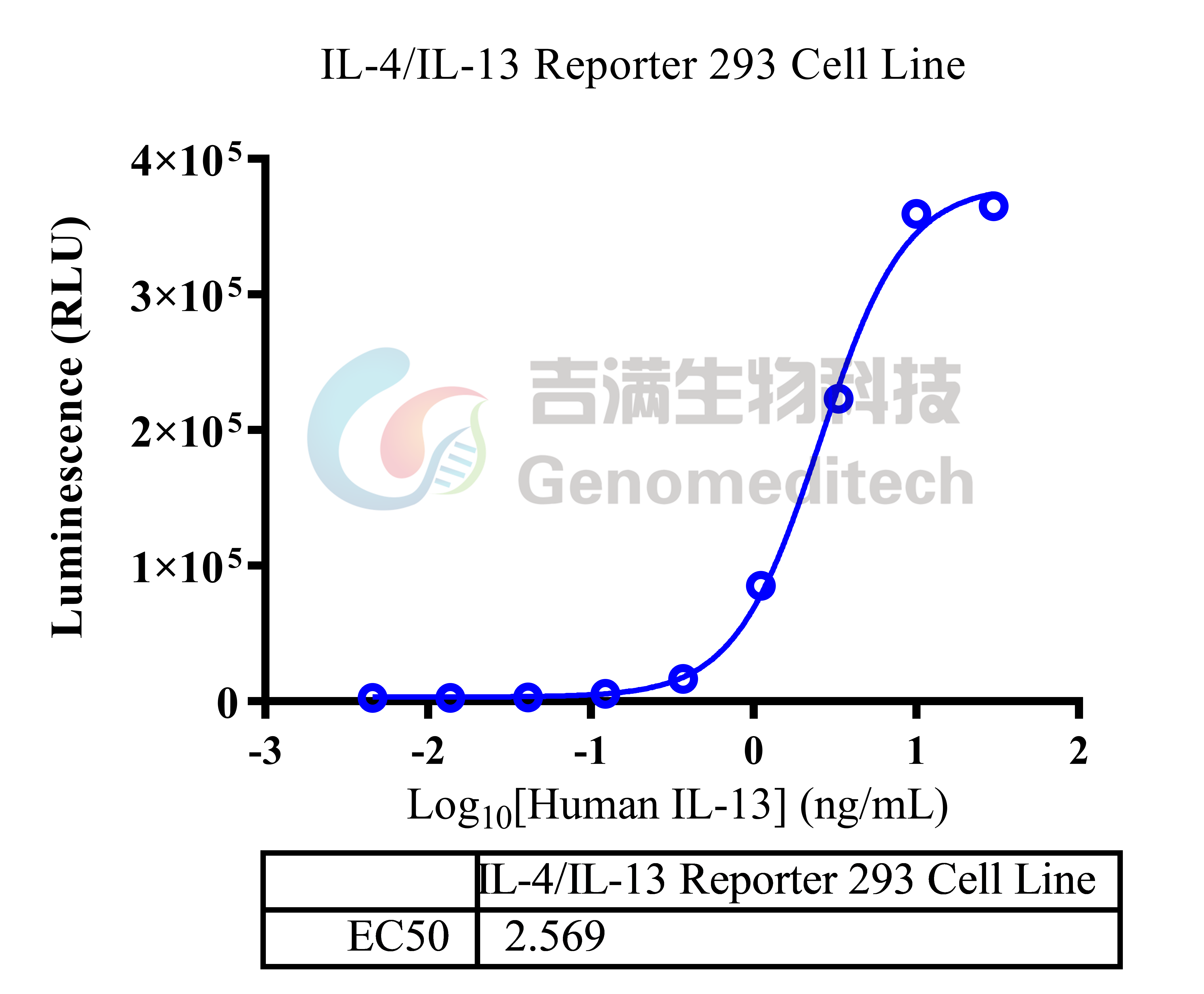 Response to Recombinant Human IL-13 Protein. The IL-4/IL-13 Reporter 293 Cell Line (Cat. GM-C01511) at a concentration of 2E4 cells/well (96-well format) was stimulated with serial dilutions of Human IL-13 Protein (Sino Biological/10369-HNAC) in assay buffer (DMEM+1% FBS+1% P.S) for 7 hours. The firefly luciferase activity was measured using the Luciferase Reporter Assay Kit (Genomeditech). The maximum induction fold was approximately [117.1]. Data are shown by drug mass concentration.