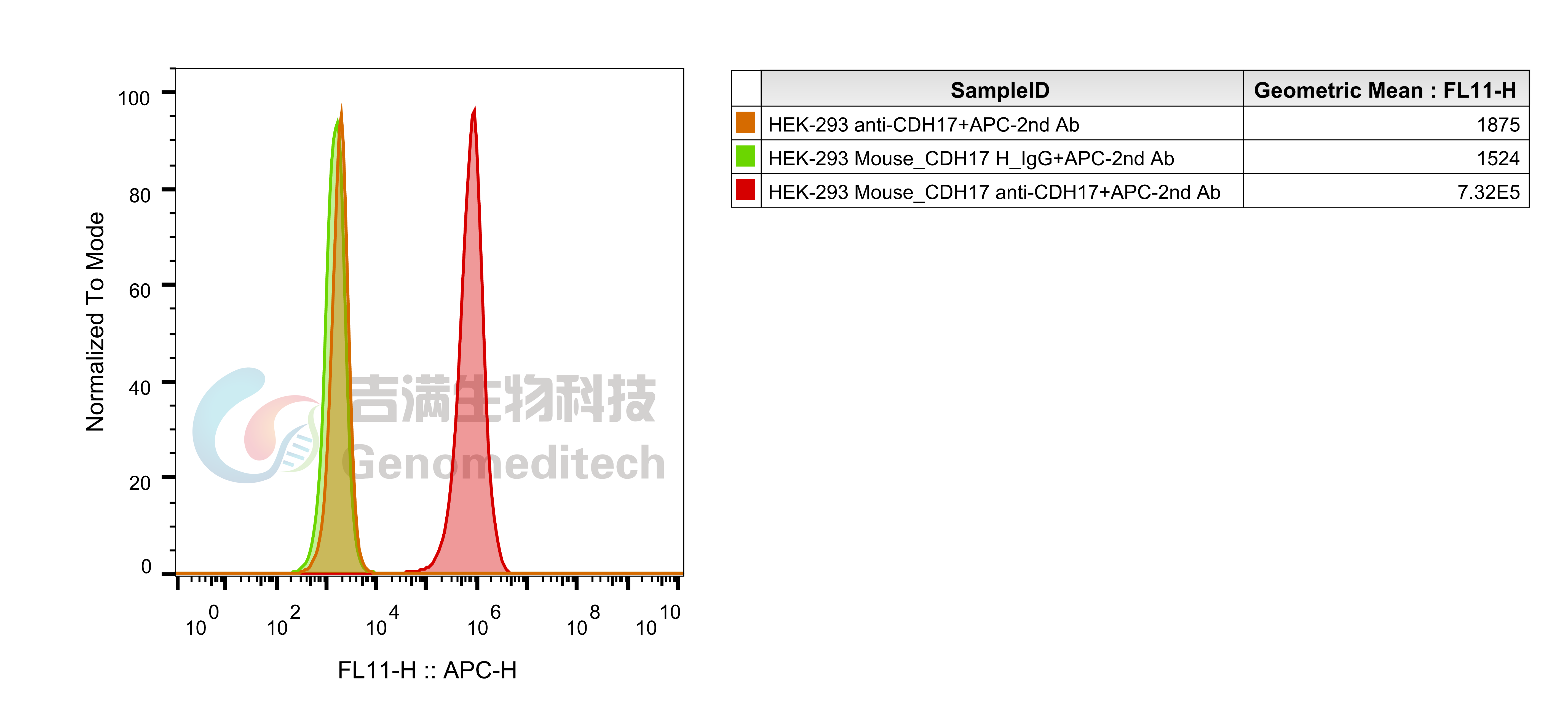 Mouse_CDH17 HEK-293 Cell Line (Cat. GM-C26466) was determined by flow cytometry using Anti-CDH17 hIgG1 Antibody(VHHl-28BB) (Cat. GM-75321AB).
