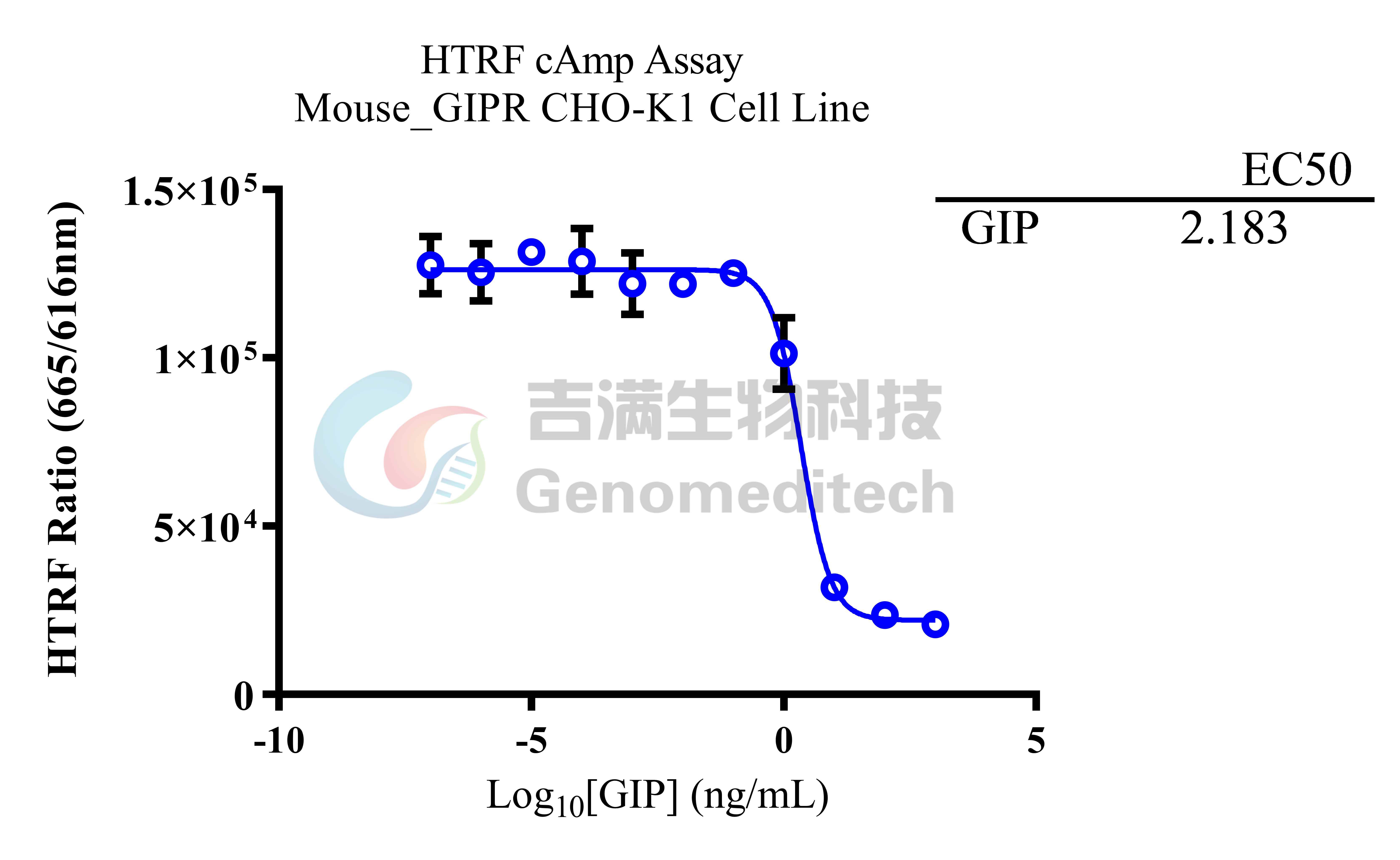 Mouse_GIPR CHO-K1 cells were seeded at a density of 7500 cells per well in white 384‑well microplates (5 µL per well). Gradient‑diluted human GlP solutions were then added, and the cells were incubated at room temperature for 30 minutes. The HTRF cAMP Gs Dynamic Detection Kit (Revvity, Cat. No. 62AM4PEB) was used according to the manufacturer’s instructions. Fluorescence signals were measured using a Molecular Devices i3x multi‑mode plate reader with excitation at 340 nm and emissions detected at 616 nm and 665 nm. The data were expressed as the 665 nm/616 nm × 100,000 (HTRF Ratio) and used to calculate the EC50 value.