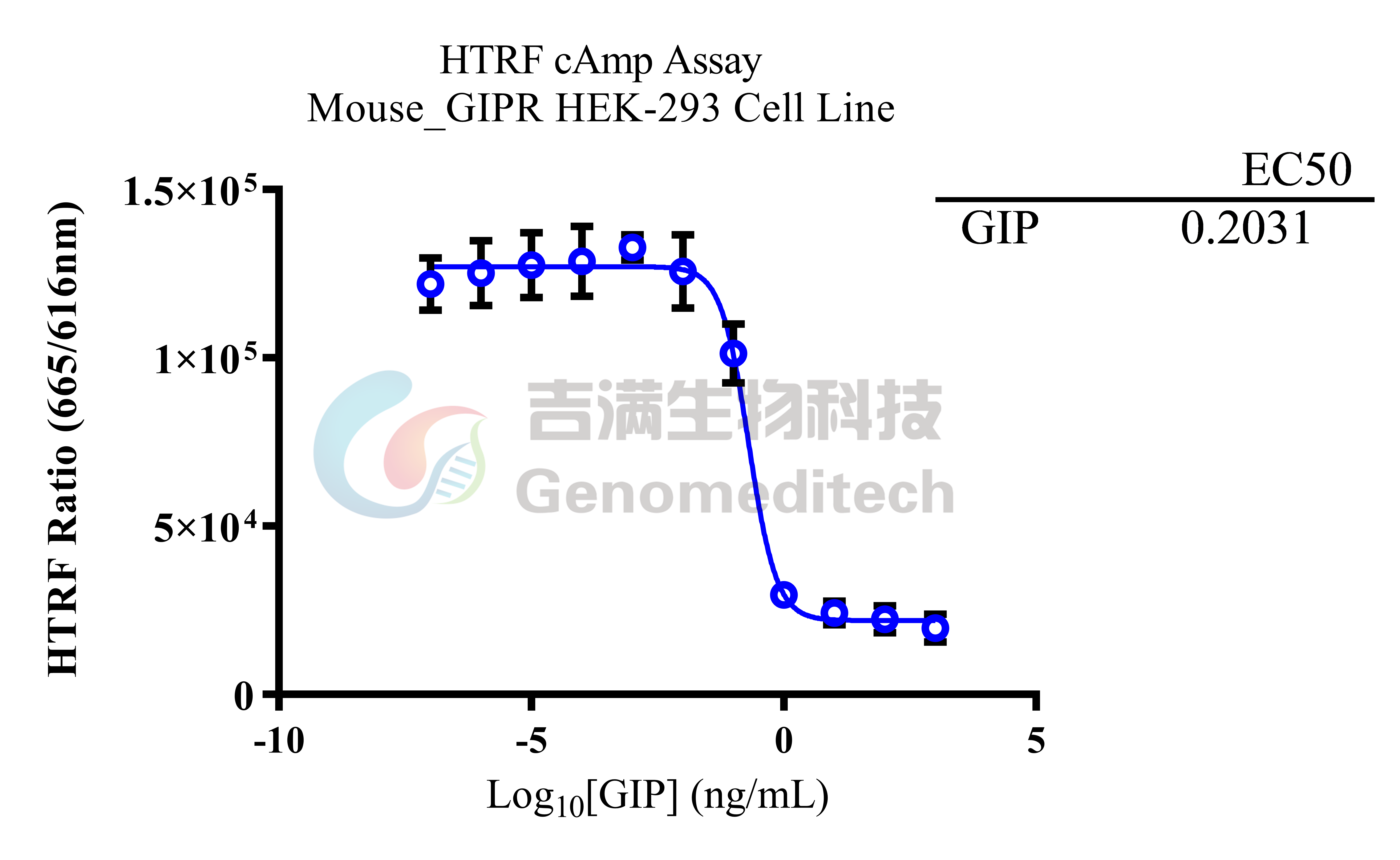 Mouse_GIPR HEK-293 cells were seeded at a density of 7500 cells per well in white 384‑well microplates (5 µL per well). Gradient‑diluted human GlP solutions were then added, and the cells were incubated at room temperature for 30 minutes. The HTRF cAMP Gs Dynamic Detection Kit (Revvity, Cat. No. 62AM4PEB) was used according to the manufacturer’s instructions. Fluorescence signals were measured using a Molecular Devices i3x multi‑mode plate reader with excitation at 340 nm and emissions detected at 616 nm and 665 nm. The data were expressed as the 665 nm/616 nm × 100,000 (HTRF Ratio) and used to calculate the EC50 value.