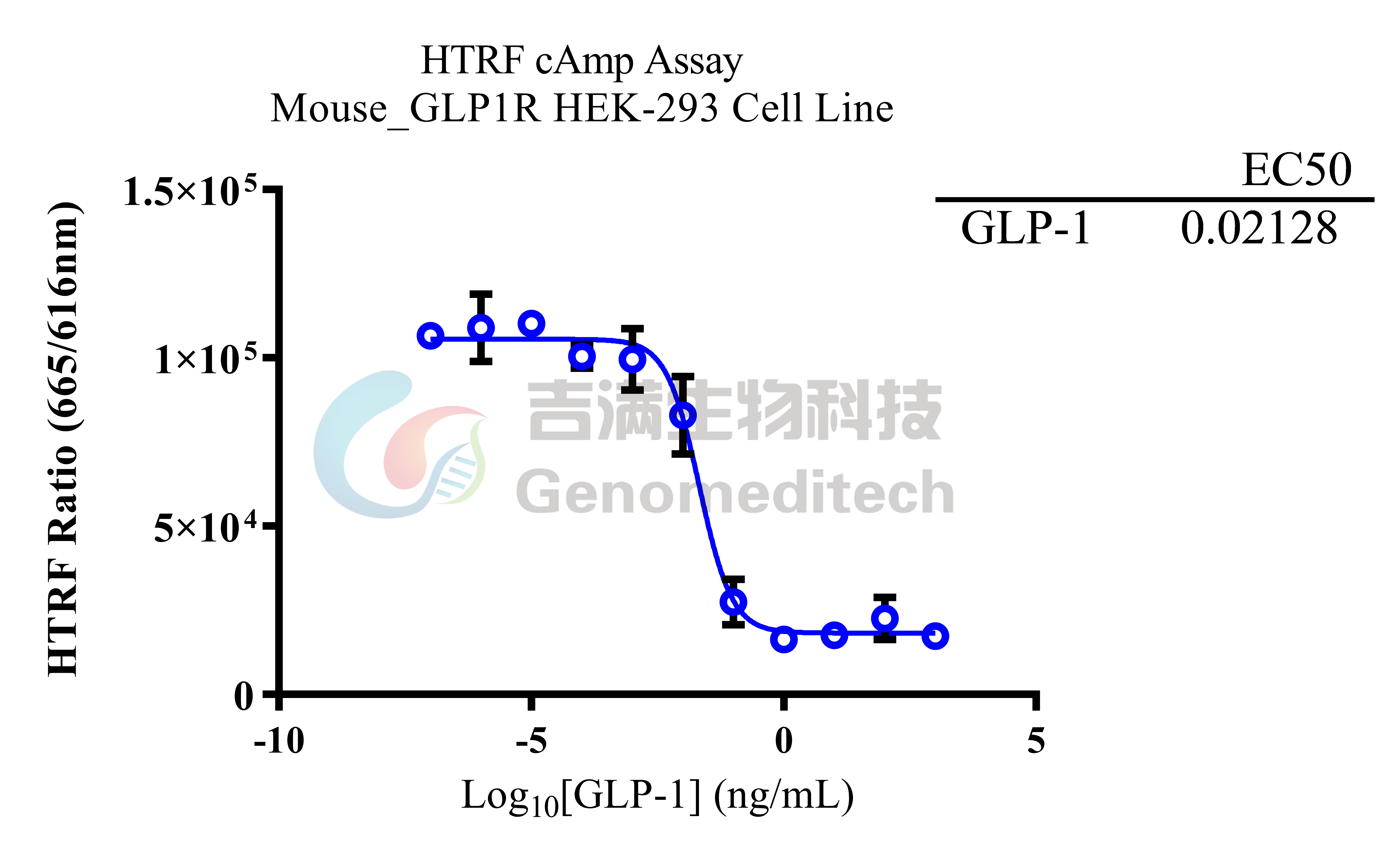 Mouse_GLP1R HEK-293 cells were seeded at a density of 7500 cells per well in white 384‑well microplates (5 µL per well). Gradient‑diluted human GLP-1 solutions were then added, and the cells were incubated at room temperature for 30 minutes. The HTRF cAMP Gs Dynamic Detection Kit (Revvity, Cat. No. 62AM4PEB) was used according to the manufacturer’s instructions. Fluorescence signals were measured using a Molecular Devices i3x multi‑mode plate reader with excitation at 340 nm and emissions detected at 616 nm and 665 nm. The data were expressed as the 665 nm/616 nm × 100,000 (HTRF Ratio) and used to calculate the EC50 value.