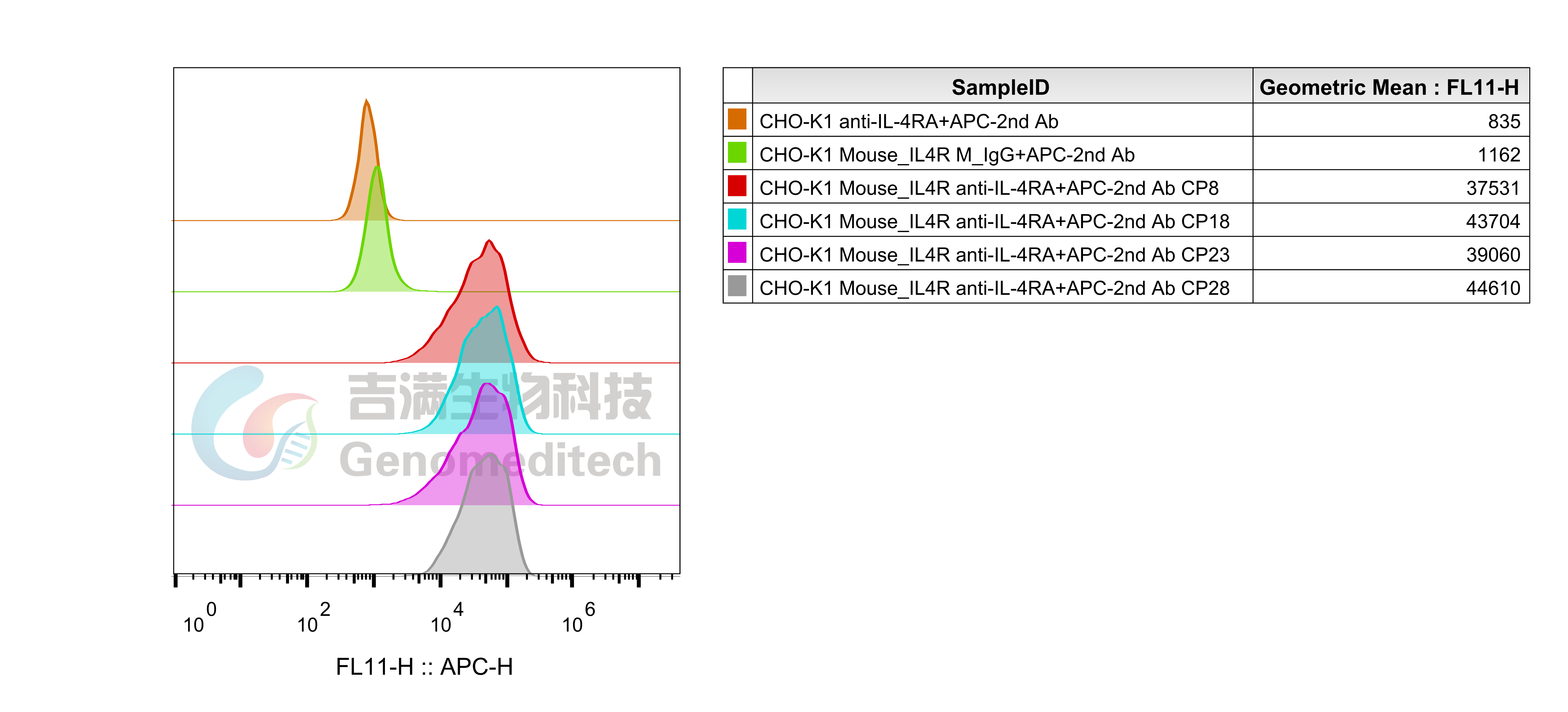 Mouse_IL4R CHO-K1 Cell Line (Cat. GM-C01562) was determined by flow cytometry using Anti-Mouse IL-4RA mIgG1 Antibody(REGN1103) (Cat. GM-88068AB).