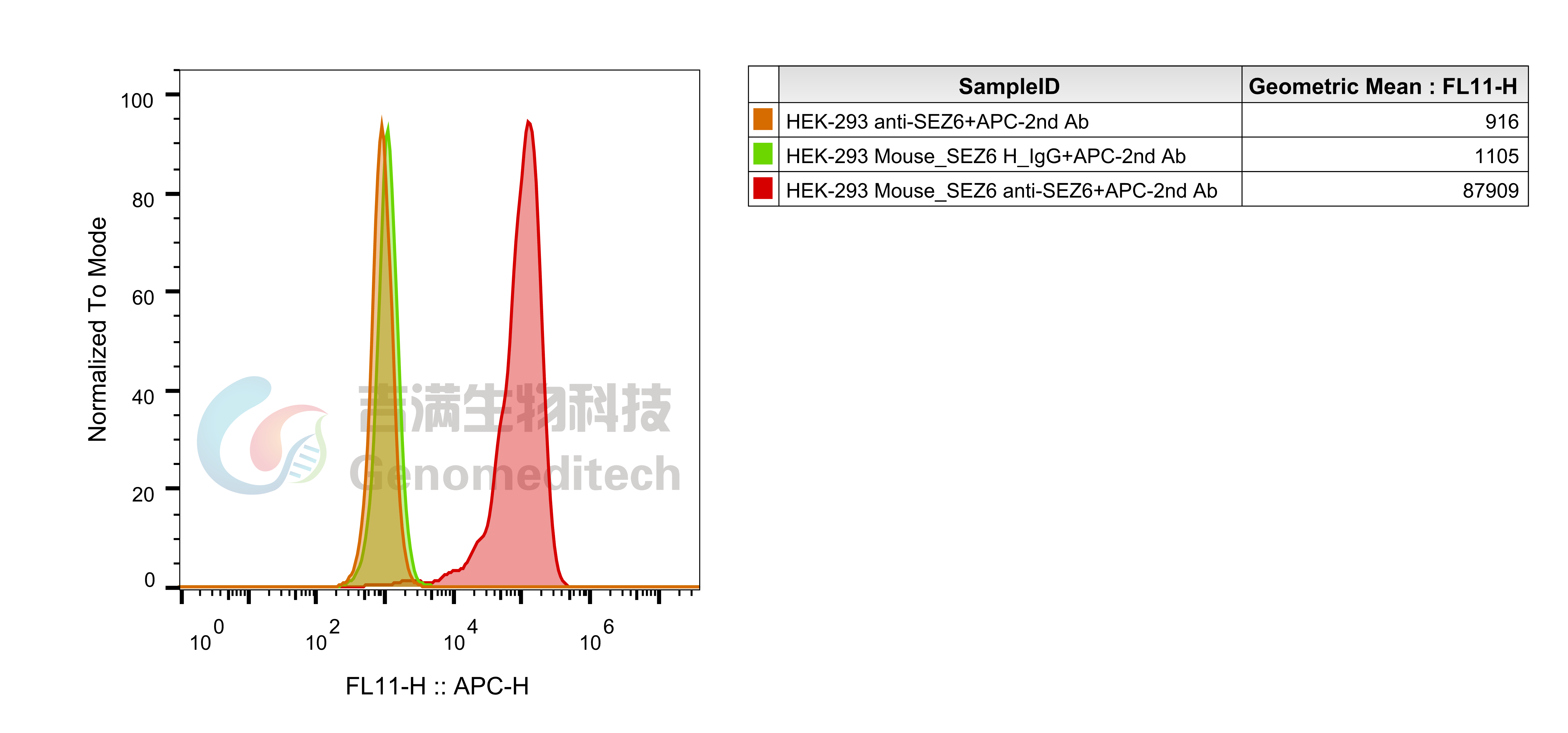 Mouse_SEZ6 HEK-293 Cell Line (Cat. GM-C37979) was determined by flow cytometry using Anti-SEZ6 hIgG1 Reference Antibody (ABBV-011) (Cat. GM-86892MAB).