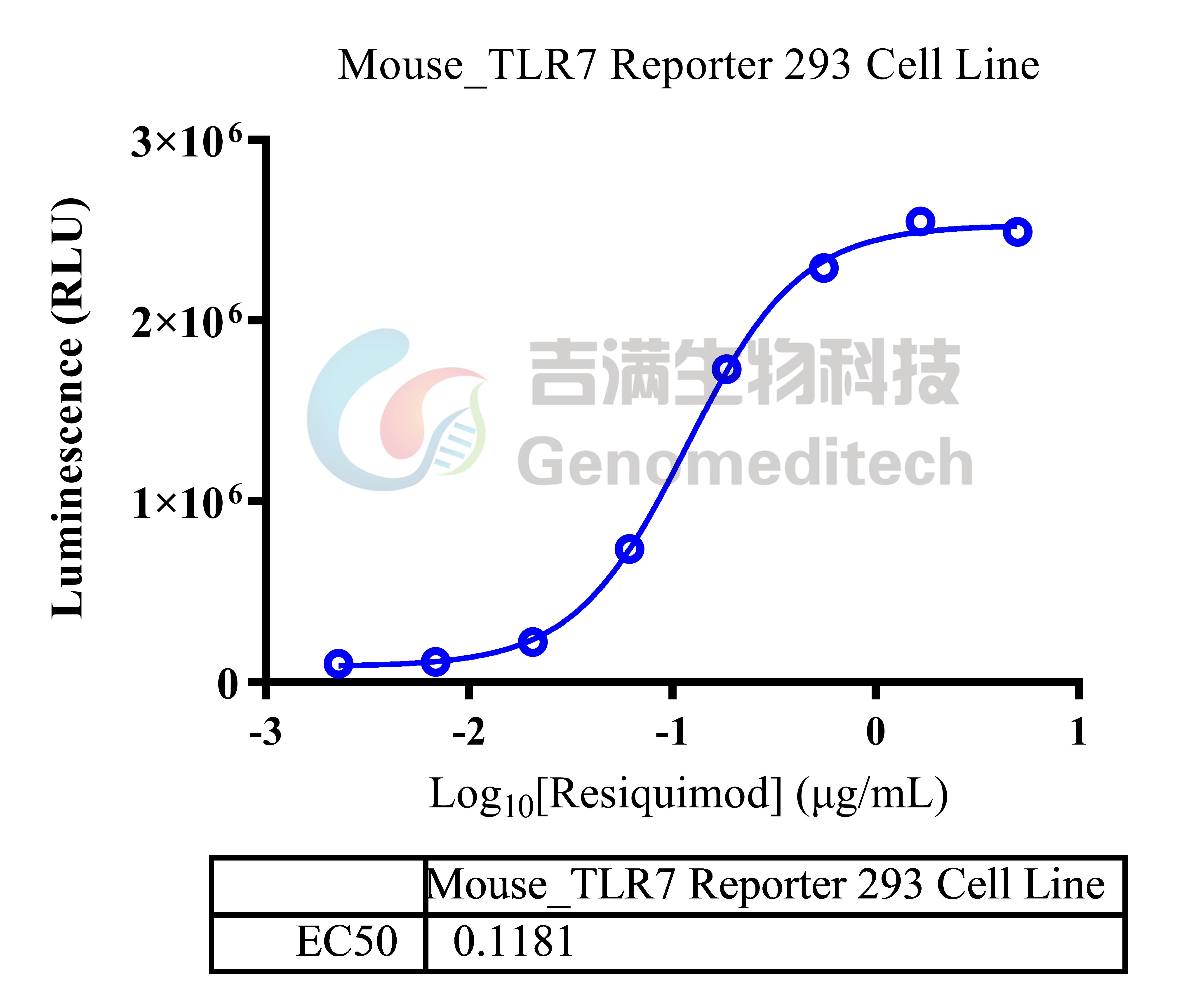 Response to Resiquimod. Mouse_TLR7 Reporter 293 Cell Line (Cat. GM-C15439) at a concentration of 1.5E4 cells/well (96-well format) was stimulated with serial dilutions of Resiquimod (MCE/HY-13740) in assay buffer (EMEM + 1% FBS + 1% P.S) for 7 hours. The firefly luciferase activity was measured using the Luciferase Reporter Assay Kit (Genomeditech). The maximum induction fold was approximately [25.8]. Data are shown by drug mass concentration.