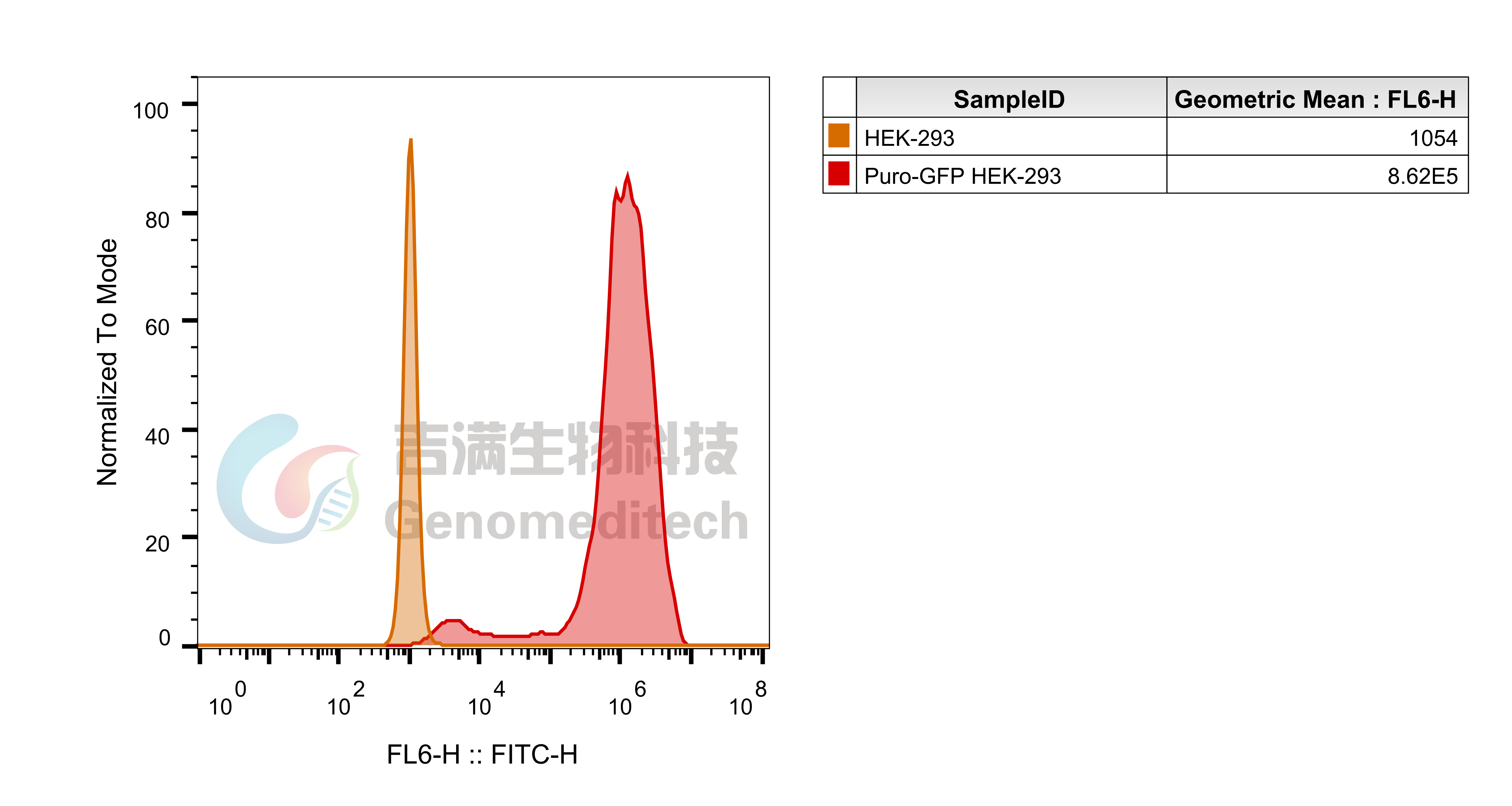 Flow cytometry analysis of green fluorescent protein (GFP) expression in Puro-GFP HEK-293 Cell Line (Cat. GM-C03933)